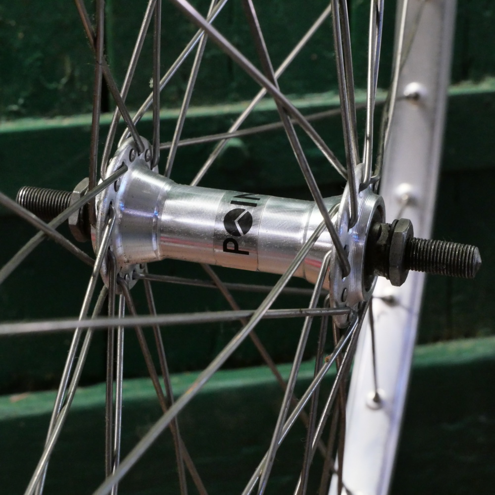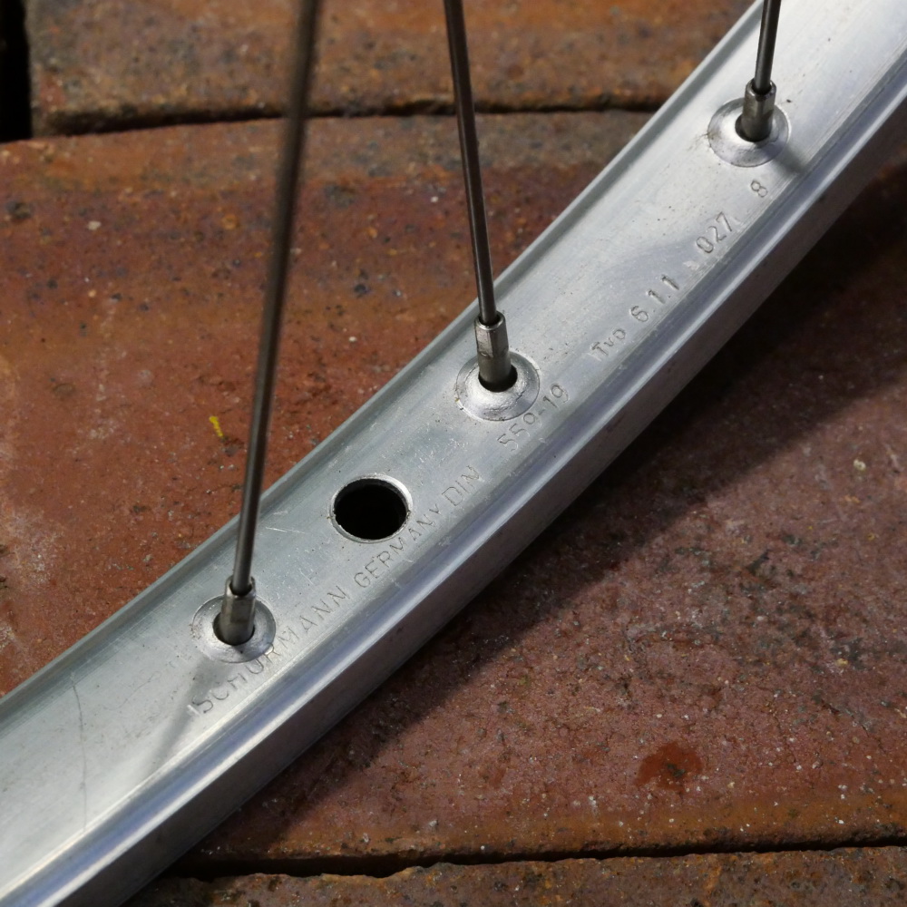 Vorderrad "Schürmann", 26 Zoll (559), Alu, Kastenfelge für Drahtreifen, Breite ca. 25 mm, Nabe Alu, Vollachse, Einbaumaß ca. 100 mm, 2 mm Speichen rostfrei, alte Neuware mit leichten Lagerungsspuren gemäß Fotos