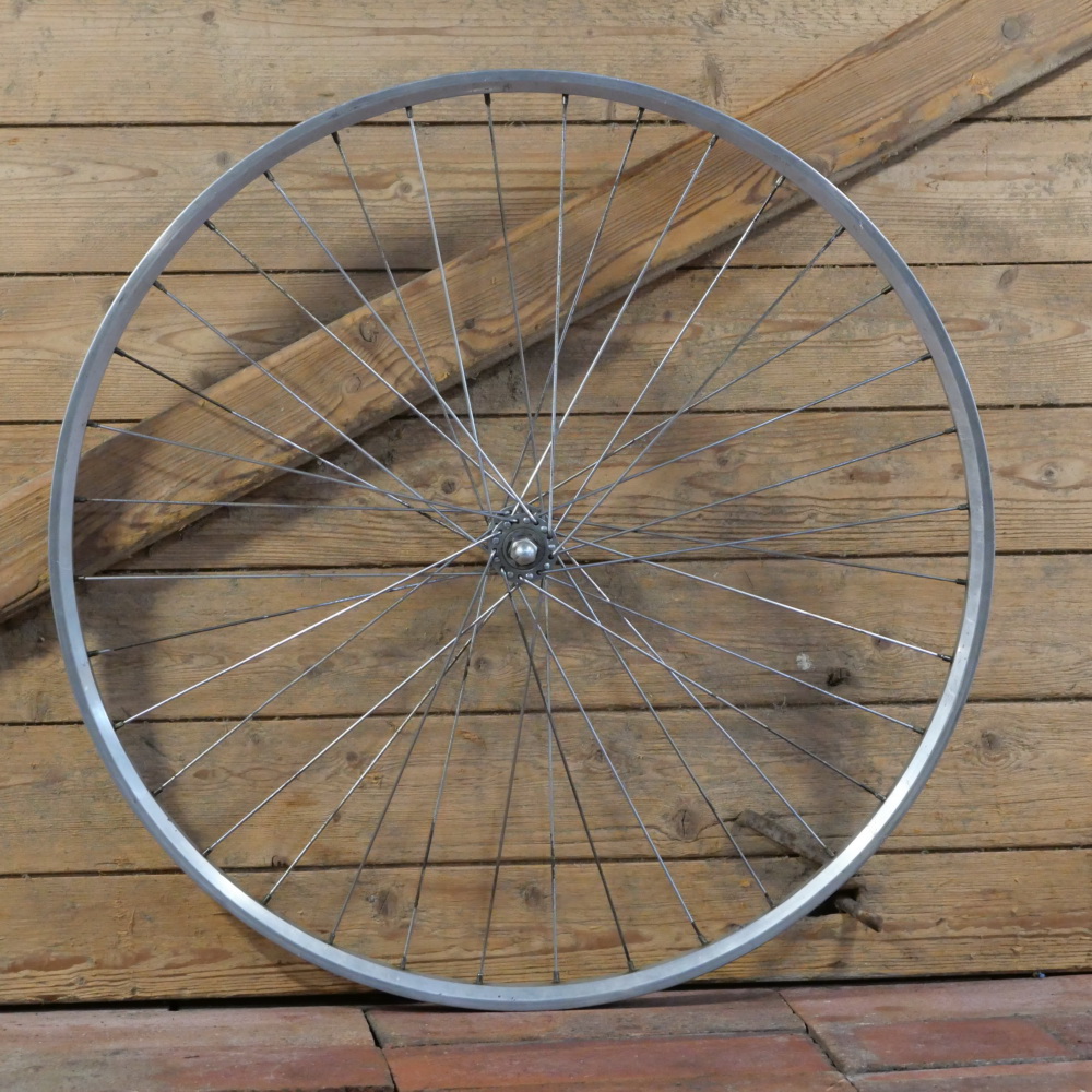 Vorderrad mit Alu-Felge, 26 Zoll (559), DDR 1976, Breite ca. 28 mm, Nabe RENAK verchromt, Einbaumaß ca. 90 mm, 36 Loch, 2 mm Speichen verchromt, gebraucht mit Patina, Lager o.k., Zustand gemäß Fotos