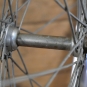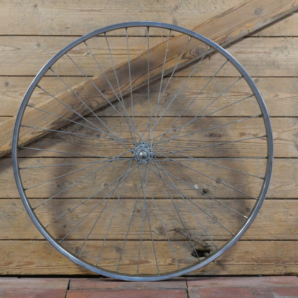 Vorderrad mit RIGIDA-Felge, verchromt, 26 Zoll (559), 60er/70er J., Breite ca. 28 mm, Nabe WECO glanzverzinkt, Einbaumaß ca. 92 mm, 36 Loch, 2 mm Speichen verzinkt, gebraucht mit Patina, Lager o.k., Zustand gemäß Fotos