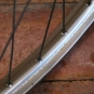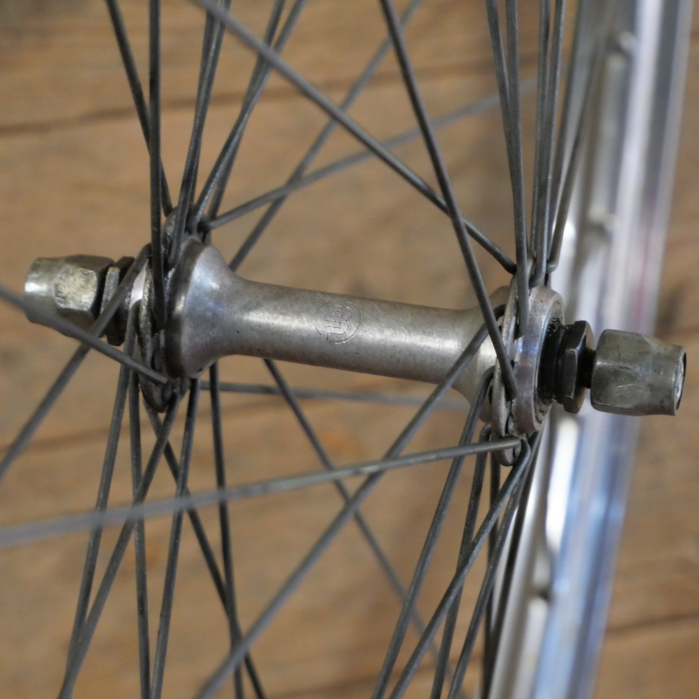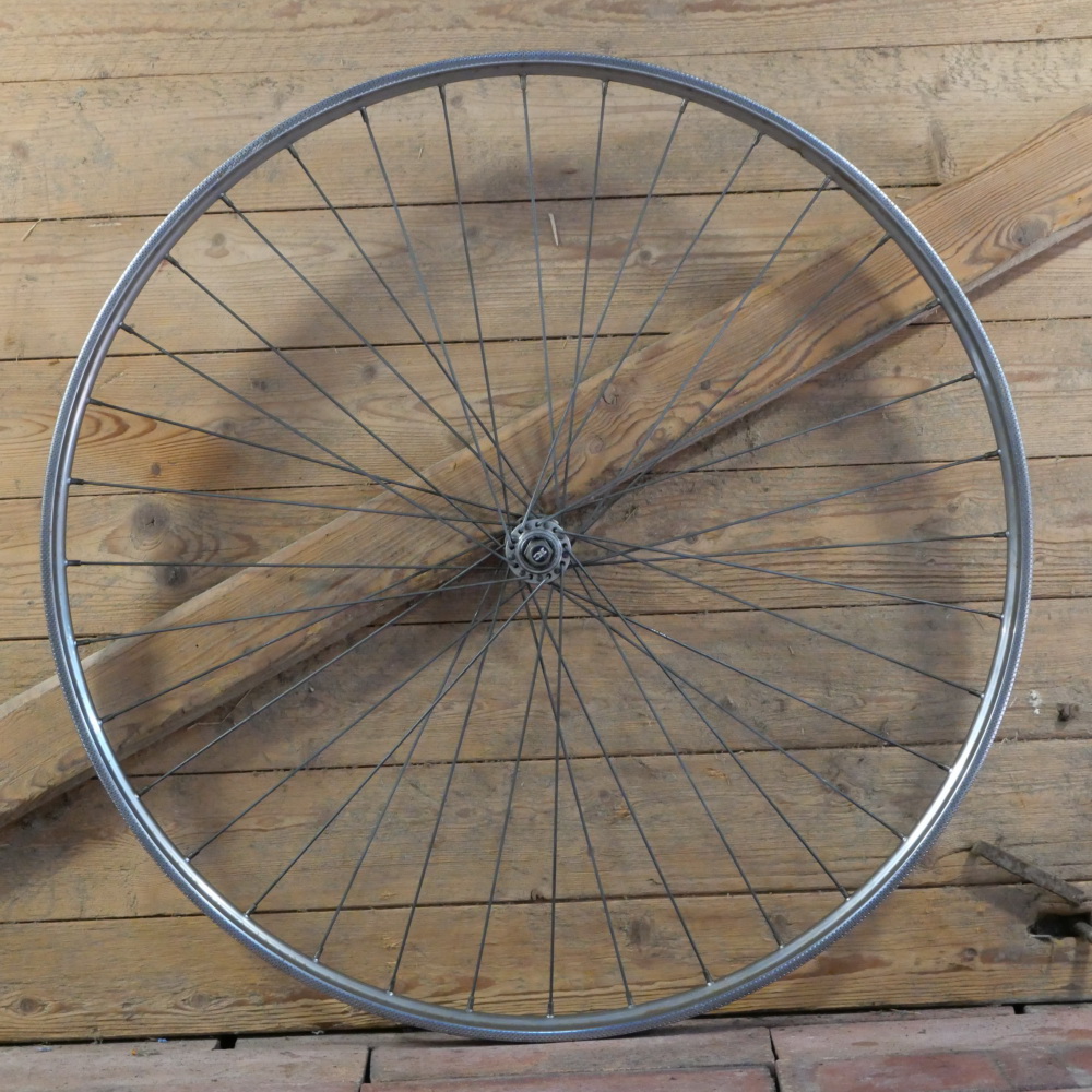 Vorderrad mit Westwood-Felge, 28 Zoll (622), verchromt, 1980er J., Breite ca. 33 mm, MAILLARD-Nabe, Einbaumaß ca. 96 mm, gebraucht mit Patina, Zustand gemäß Fotos
