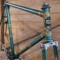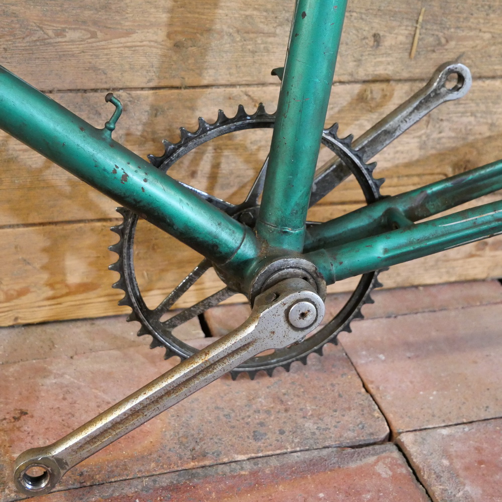 Fahrrad - Herrenrahmen "Goebel", 1950er J., Rahmennummer: 888XXX, Rahmenhöhe: 56cm, 28 Zoll, Sportmodell, sehr hochwertiger Rahmen, Gabel- und Hinterbaurohre profiliert, BSA Keillager, Originallack grün-metallic und gold mit weißen Zierlinien, Lager o.k., gebrauchsbdingte, schöne Patina, Zustand gemäß Bildern