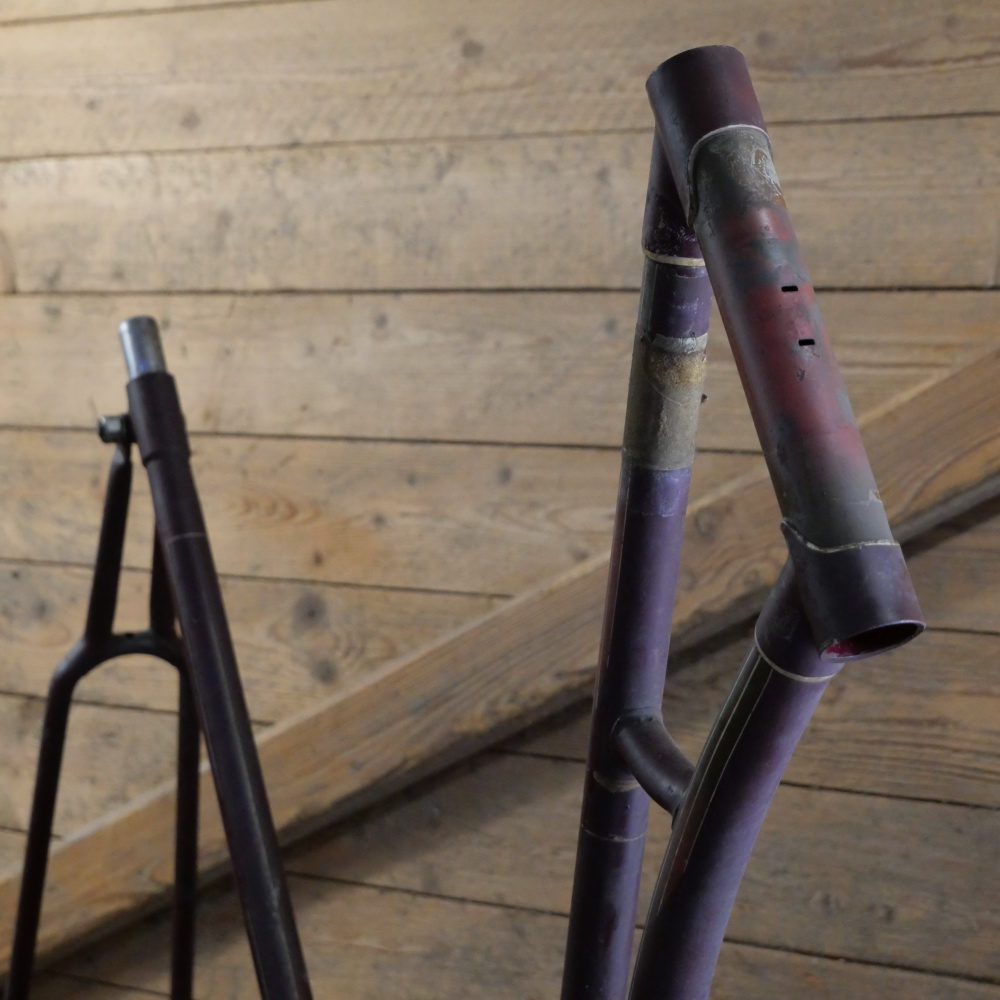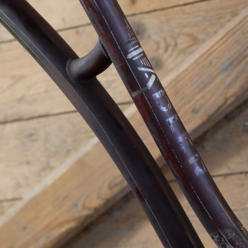 Fahrradrahmen ADLER, 28 Zoll, Damenausführung für Tourenrad, 40er/50er J., weinrot, Linien weiß/gold, OHNE Gabel! Rahmenhöhe 55 cm, Einbaubreite ca. 110 mm, Rahmennummer 1537XXX, Tretlager-Muffe für ADLER-Lager 85/35 mm, Steuerkopf 30/210 mm, gebraucht, Zustand gemäß Fotos