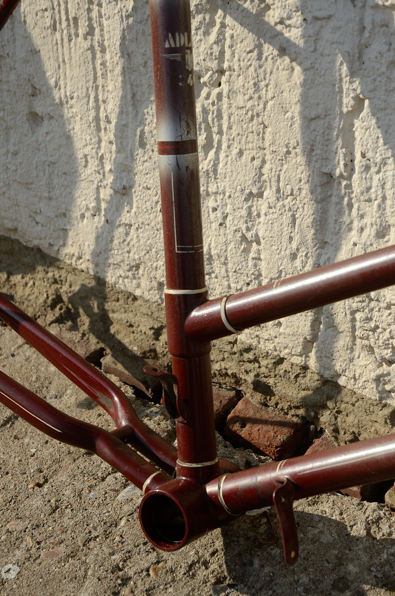 Fahrradrahmen "ADLER", Damenausf., Sport, weinrot , 26 Zoll, RH=55cm, 50er J., incl. Gabel ohne Tretlager ohne Steuersatz, Linierung: weiss, gefasste Muffen cremefarben. Ideal zum Aufbau eines Klassikrades nach eigenen Wünschen und Vorstellungen.