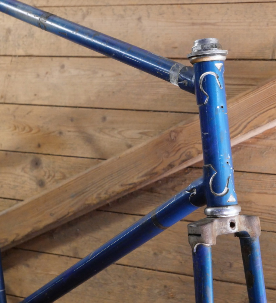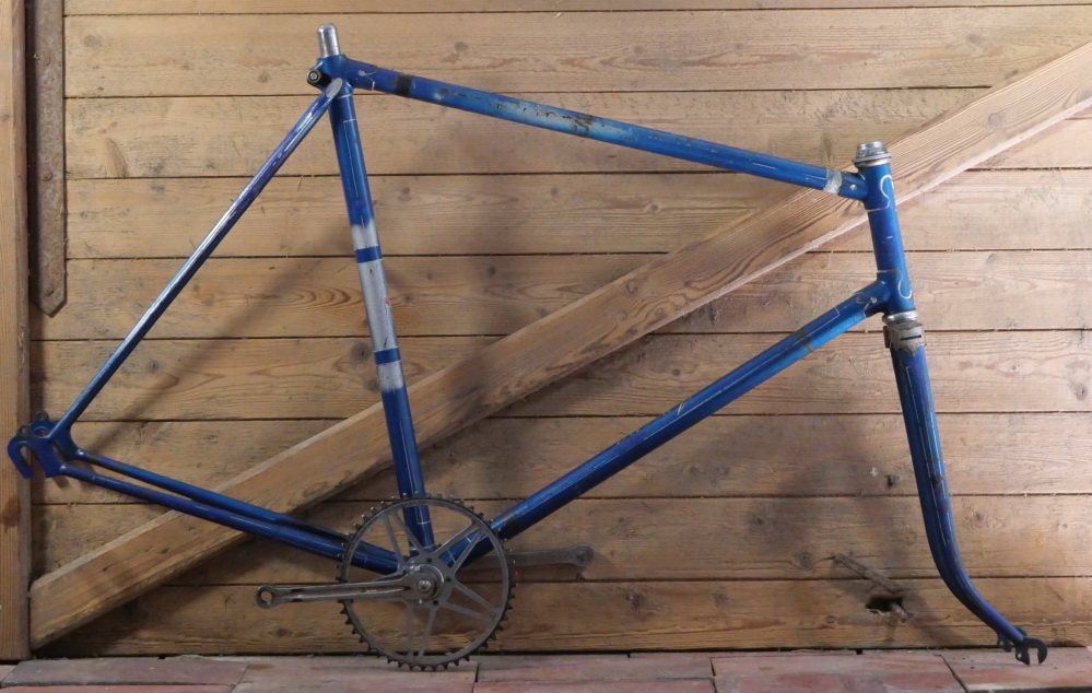 Fahrradrahmen ARCONA, E. Machnow/Berlin, Herrenausführung, Sportrad, 50er J., 26 Zoll, blau, Linien silber, Rahmenhöhe 58 cm, Oberrohr 60,5 cm, Rahmennummer 210XXX, Einbaubreite 111 mm, Thompson Keillager, Kettenblatt 48 Zähne, Lager o.k., ohne Steuerkopfschild,gebraucht mit Patina, Zustand gemäß Fotos