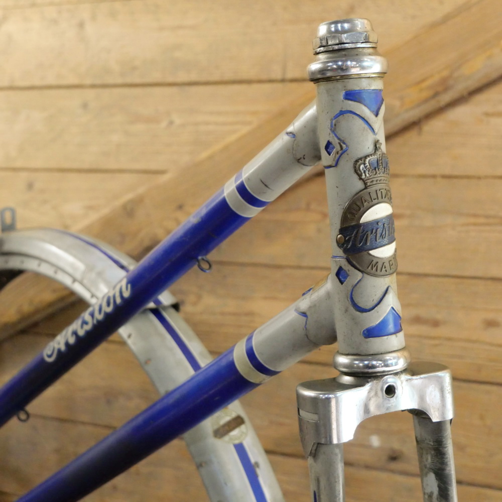 Fahrradrahmen ARISTON de Luxe, für Sportrad, Damen, 26 Zoll, 50er J., Stahl, grau/blau, Linien weiß/blau, Rahmenhöhe 55 cm, Einbaumaß ca. 112 mm, Thompson-Keillager verchromt, Kettenblatt 46 Zähne, Rahmen-Nr. 906XXX, gebraucht mit schöner Patina, Lager gut, inkl. original Schutzbleche, Zustand gemäß Fotos