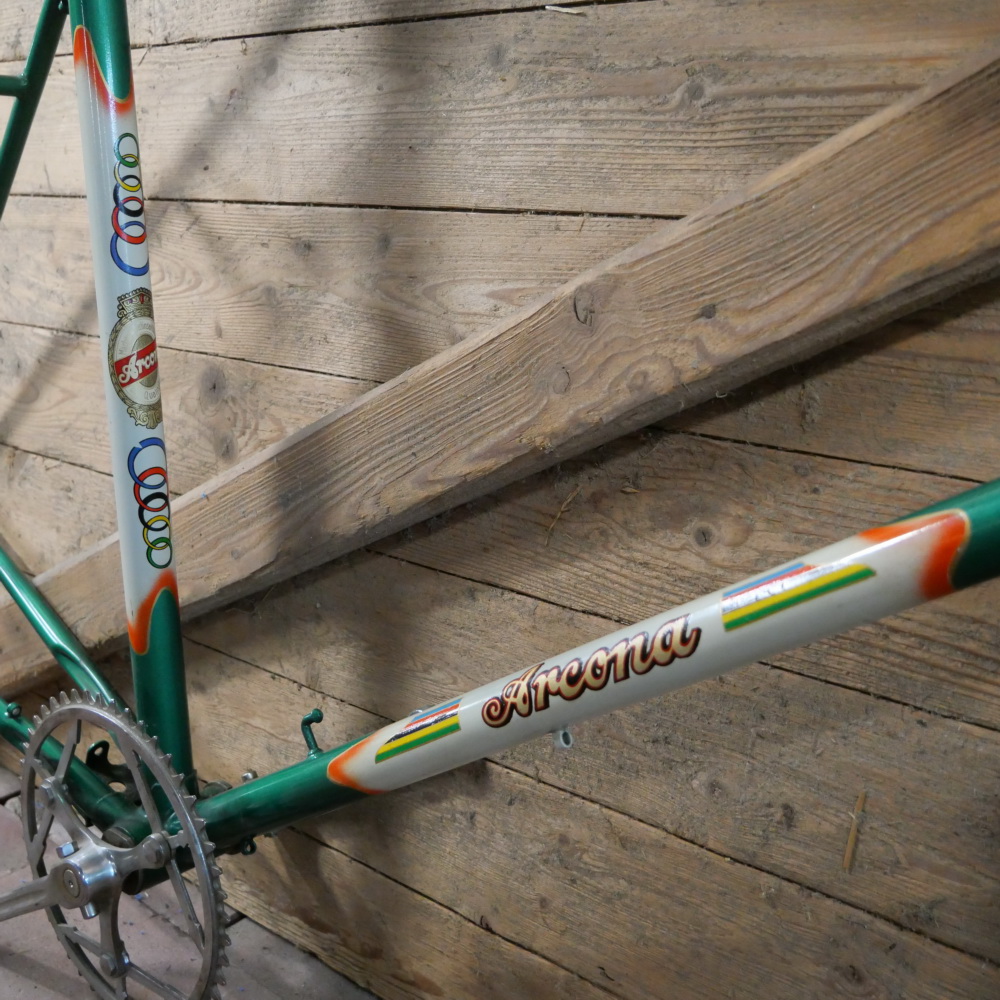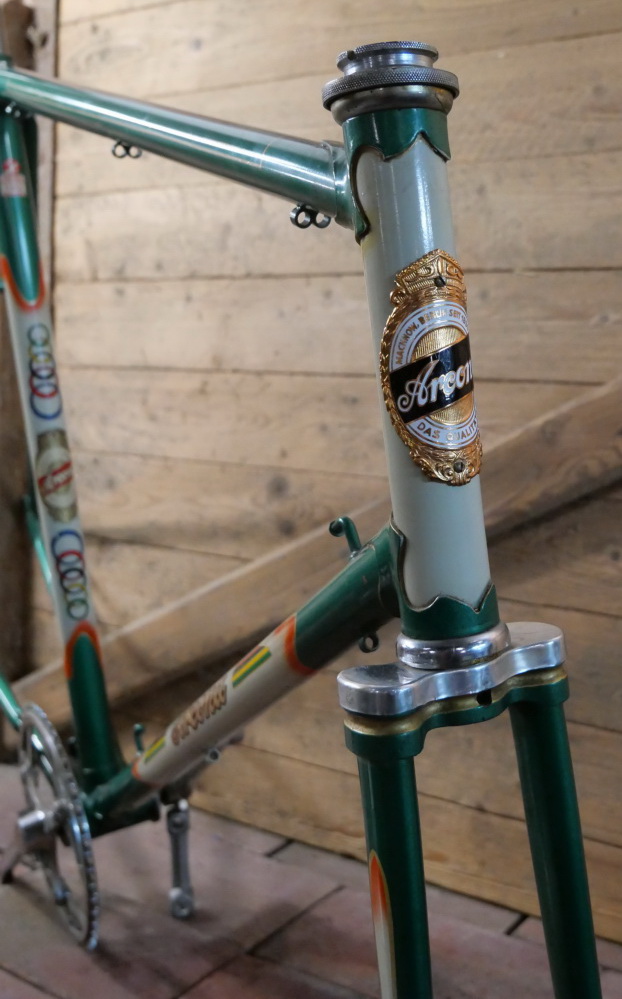 Fahrradrahmen Arcona, Herrenausführung für Sportrad, 26 Zoll, 1950er/60er J., Originallack grün/weiß, Goldlinien und Olympiadekor hochwertiges Fabrikat mit Nervexmuffen, Innenlager BSA und Kurbeln mit Keilbefestigung, Rahmennummer: 335XXX, Rahmenhöhe 59 cm, alte Neuware mit minimalen Lagerspuren, Zustand top, siehe Fotos