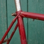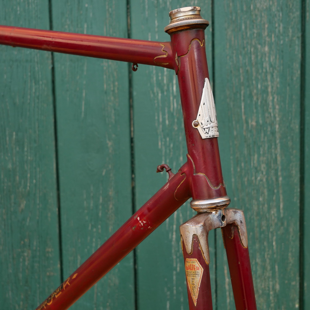 Fahrradrahmen BAUER Mod. Super Sport, Herren, 28 Zoll, Stahl, Bj. 1949/50, weinrot/Golddekor, unterverzinkt, Rahmenhöhe 59,5 cm, Einbaumaß 122 mm, für BSA-Lager, Rahmennummer 1447XXX, gebraucht mit schöner Patina, Steuerlager o.k., Zustand gemäß Fotos