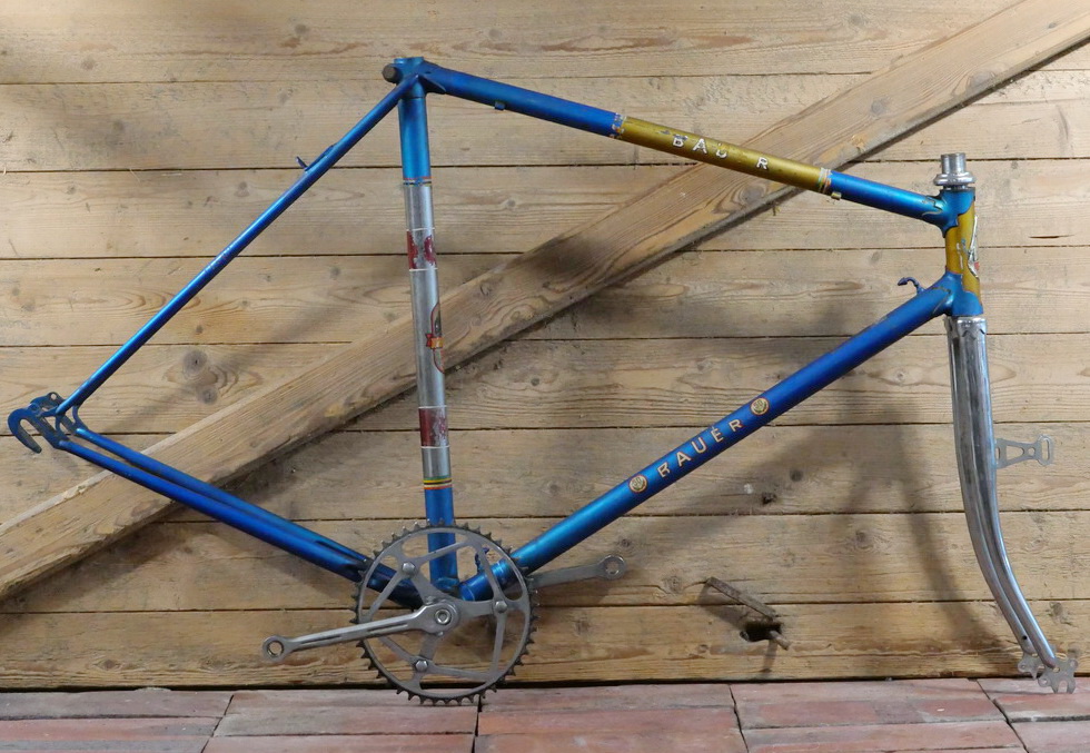 Fahrradrahmen BAUER Super-Sport Jubiläumsrad, Herrenausführung für Sportrad, 28 Zoll, 1960er Jahre, blau/silber/gold, Rahmenhöhe 55 cm, Einbaumaß ca. 114 mm, Rahmennummer 2451XXX, BSA-Keillager mit Kettenblatt 46 Zähne, Kurbeln BAUER gemarkt, gebraucht mit Patina, ohne Steuerlager, Tretlager gut, Zustand gemäß Fotos