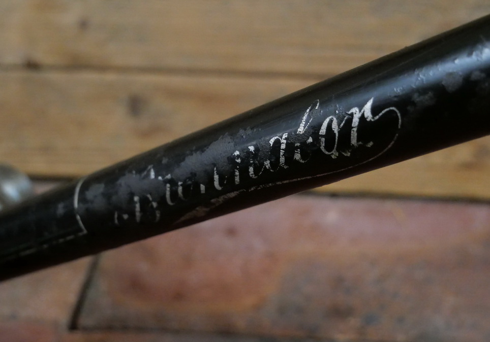 Fahrradrahmen BRENNABOR, Herrenausführung, 28 Zoll, 1930er Jahre, schwarz, Strahlenkopf gold, Linien weiß/blau, gebr.