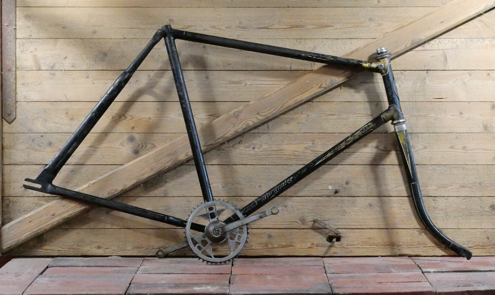 Fahrradrahmen BRENNABOR, Herrenausführung, 28 Zoll, 1930er Jahre, schwarz, Strahlenkopf gold, Linien weiß/blau, Rahmenhöhe 60 cm, Einbaumaß ca. 109 mm, Rahmennummer 1888XXX, Glockenlager mit Kettenblatt 45 Zähne, gebraucht mit Patina, Zustand gemäß Fotos
