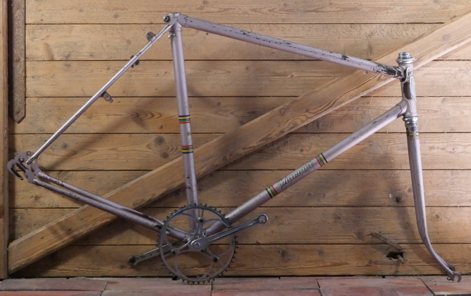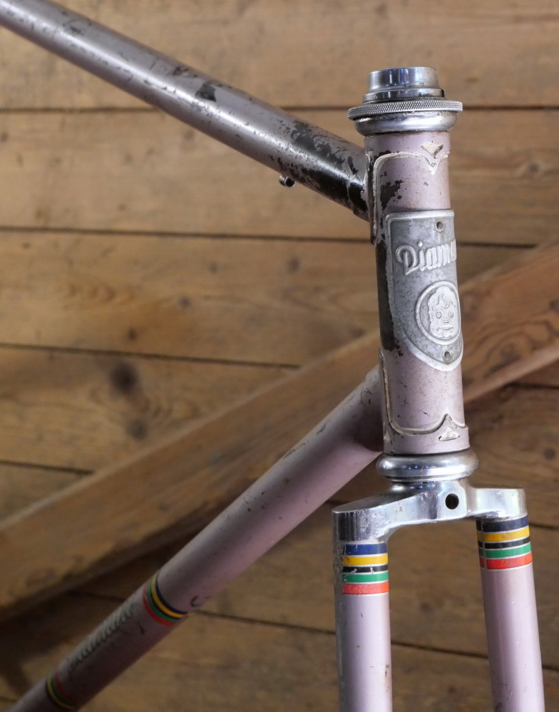 Fahrradrahmen DIAMANT, Herrenausführung, Sportrad, DDR 60er/70er J., 28 Zoll, altrosa, Rahmenhöhe 56 cm, Oberrohr 57 cm, Rahmennummer 3502XXX, Einbaubreite 112 mm, BSA Keillager, Kettenblatt 48 Zähne, Lager o.k., gebraucht mit Patina, Zustand gemäß Fotos