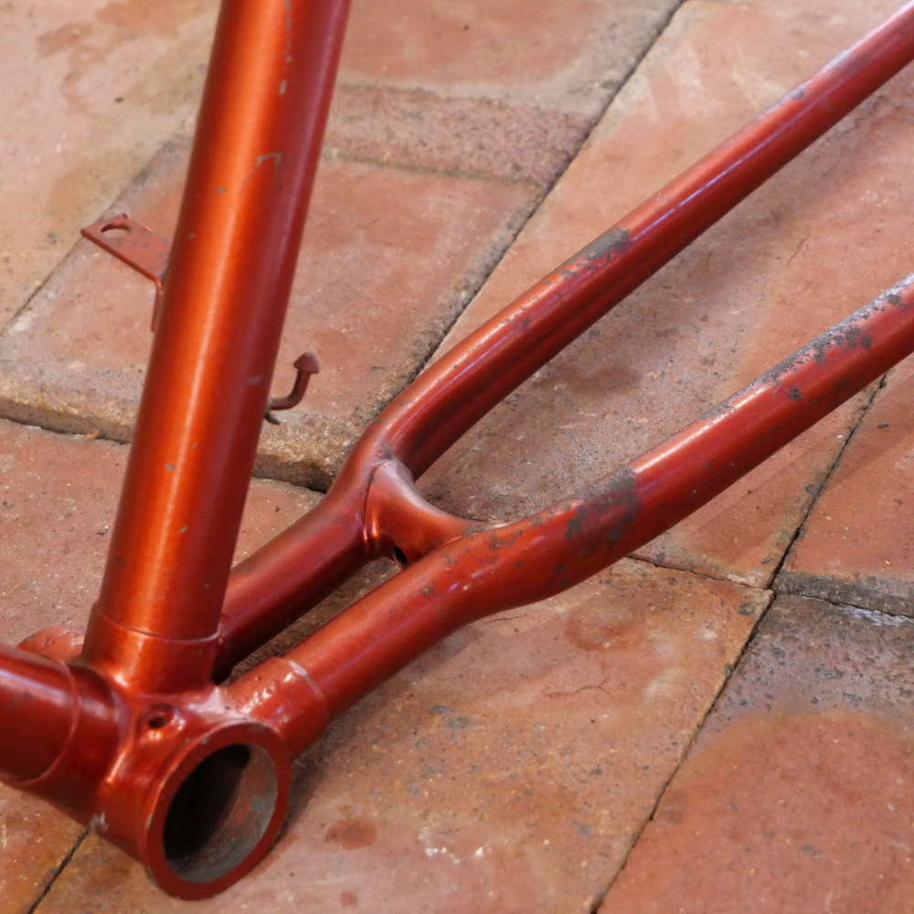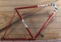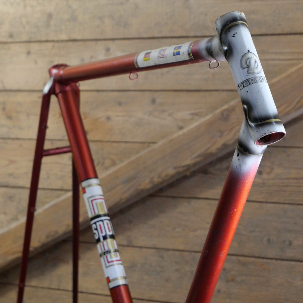 Fahrradrahmen DÜRKOPP, 26 Zoll, Herrenausführung für Sportrad, 50er/60er J., orangerot/weiß/ schwarz, Linien gold, Rahmenhöhe 55,5 cm, Oberrohrlänge 59 cm, Einbaubreite 108 mm, Rahmennummer 2201XXX, Tretlager BSA-Muffe 34/66 mm, alte Neuware mit schöner Patina, OHNE Gabel! Steuerkopf 30/140 mm, Zustand gemäß Fotos