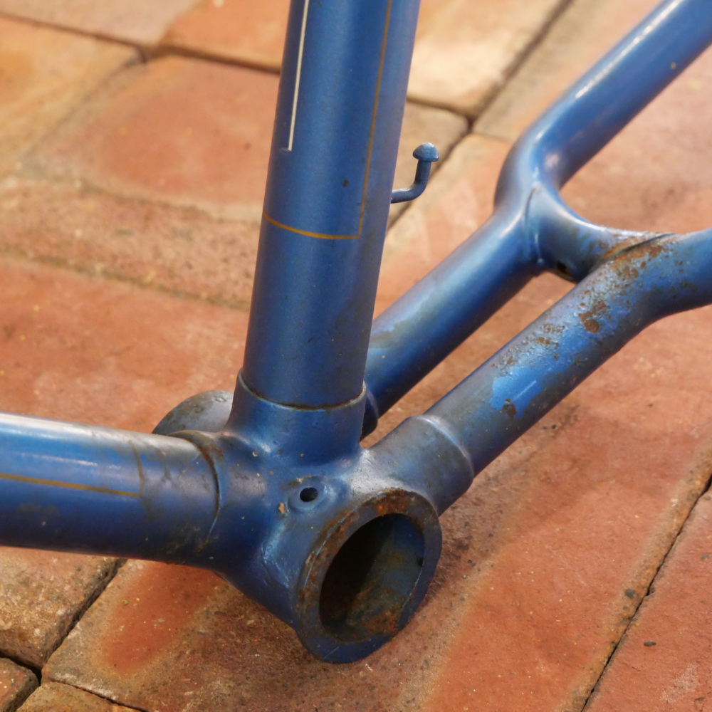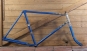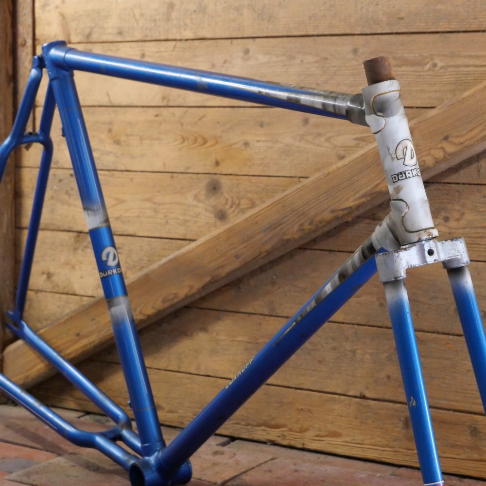 Fahrradrahmen DÜRKOPP, 26 Zoll, Herrenausführung für Tourenrad, 50er/60er J., blau/weiß/schwarz, Linien gold/weiß, Rahmenhöhe 54,5 cm, Oberrohrlänge 61 cm, Einbaubreite 108 mm, Rahmennummer 2158XXX, alte Neuware mit schöner Patina, noch kein Gabel-Gewinde geschnitten!, Noch kein Tretlager-Gewinde geschnitten (BSA)! Zustand gemäß Fotos