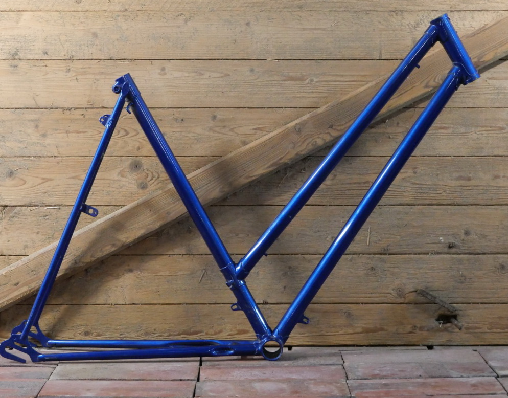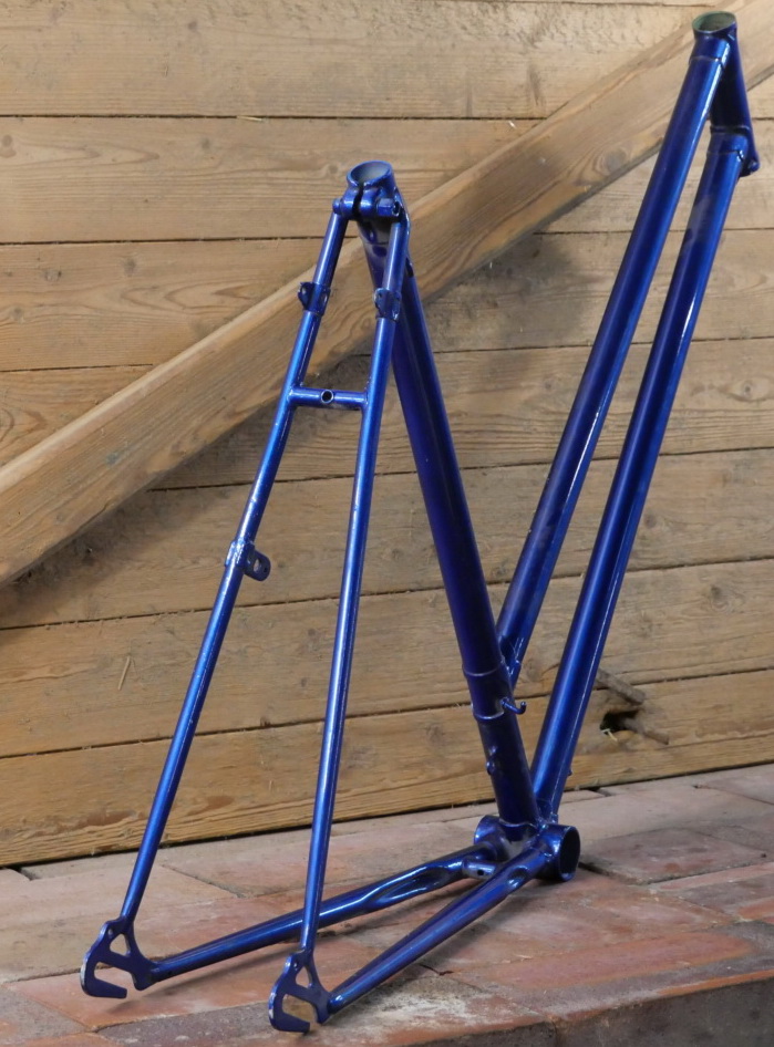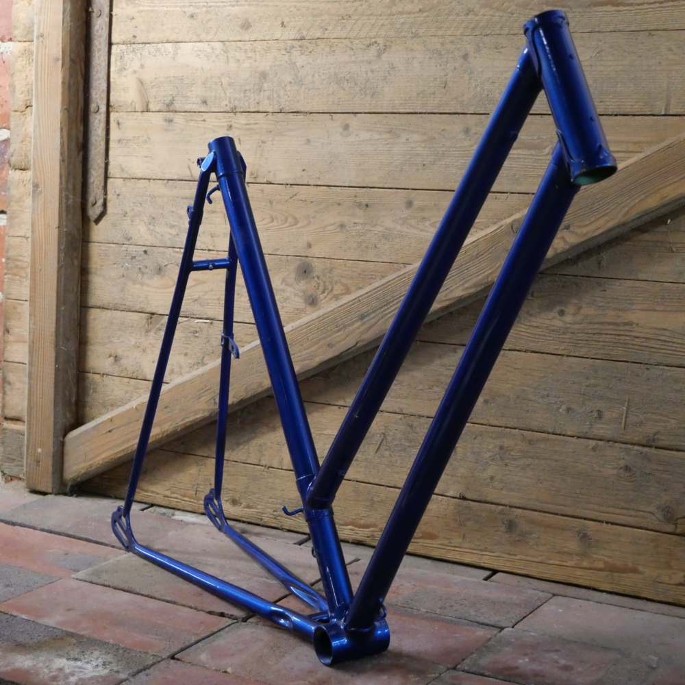 Fahrradrahmen Diamant, Damenausführung für Sportrad, 28 Zoll, 1950er/60er J., ältere Neulackierung blau-metallic, Rahmenhöhe 55,5 cm, Rahmennummer 437XXX, ohne Gabel! Steuerrohr: Durchmesser für 1 Zoll, Höhe 130mm, für Innenlager BSA, ohne Steuerkopfschild, Zustand sehr gut, siehe Fotos