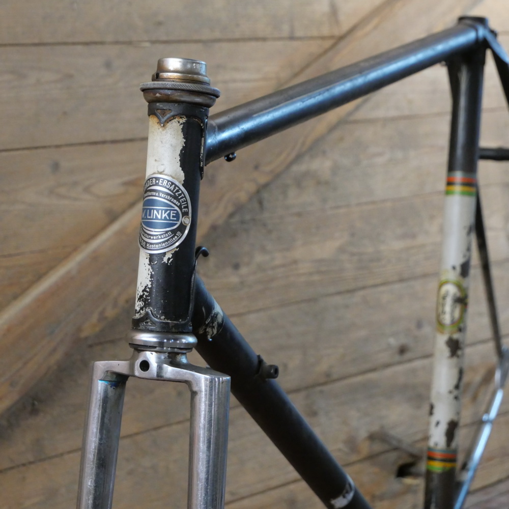 Fahrradrahmen FBL/W. Linke, Berlin, Herrenausführung für Rennrad 27/28 Zoll, Stahl, DDR frühe 1950er Jahre, schwarz/weiß, Linien gold/weiß, sehr hochwertige Ausführung, Rahmenhöhe 55 cm, Rahmennummer 2938XXX, Innenlager BSA, gebraucht, Substanz gut, Zustand gemäß Fotos