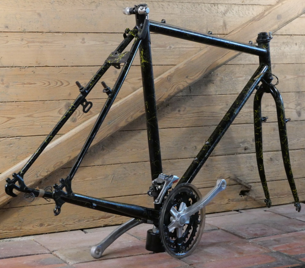 Fahrradrahmen/Frameset CHICAGO Herrenausführung für Treckingrad, 28 Zoll, 90er J., schwarz mit Strichdekor gelb, Rahmenhöhe 52 cm, Einbaumaß ca. 135 mm, mit BSA-Lager, SHIMANO Acera Kurbeln 44/34/24 Zähne und Umwerfer, Steuersatz Stahl, schwarz, alte Neuware mit leichter Lagerpatina, Zustand gemäß Fotos