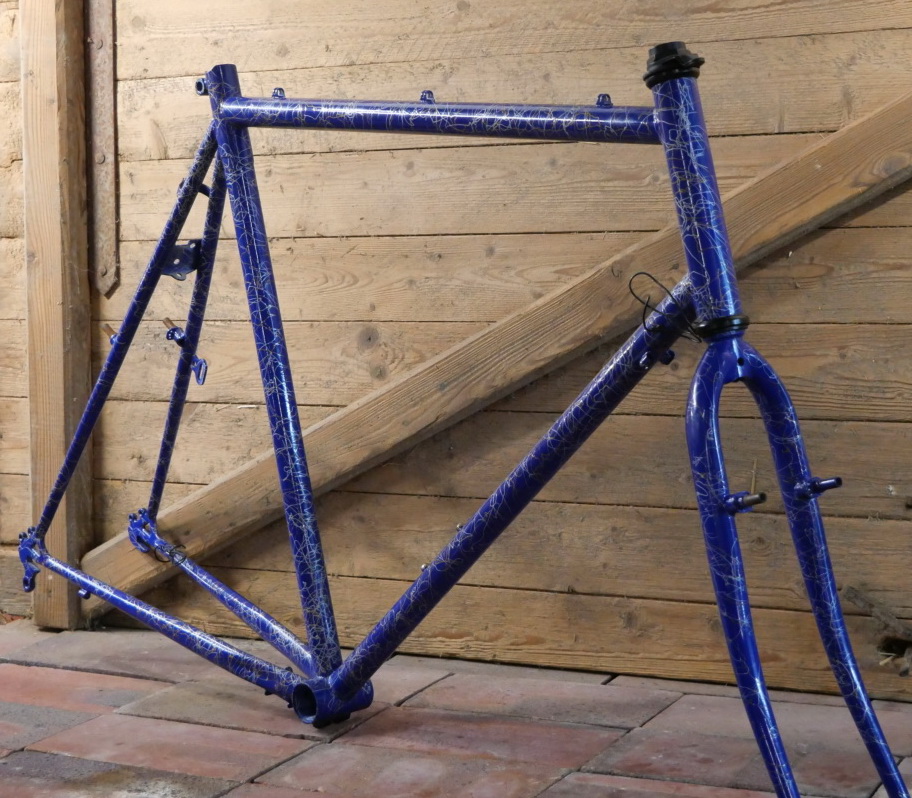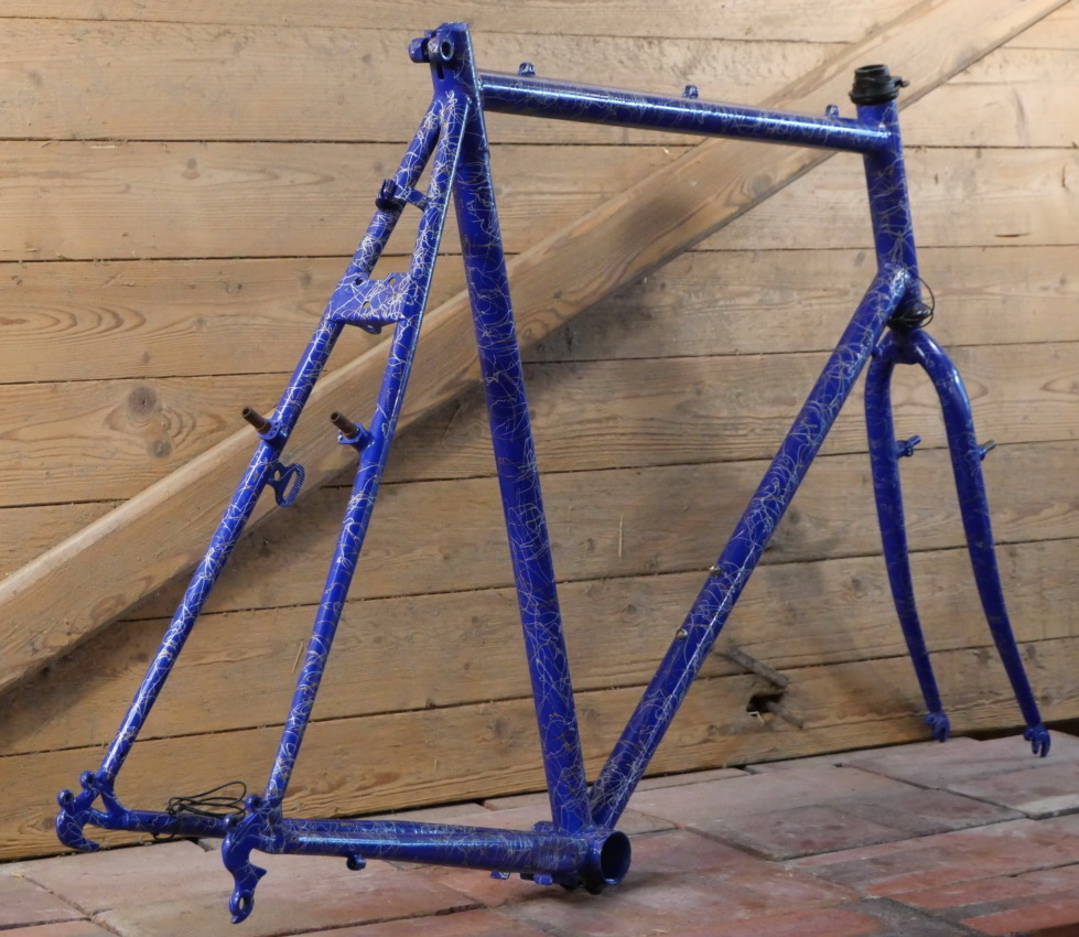 Fahrradrahmen/Frameset Herrenausführung für Treckingrad, 28 Zoll, 90er J., blau mit Strichdekor weiß/gold, Rahmenhöhe 61 cm, Einbaumaß ca. 132 mm, für BSA-Lager, Steuersatz Stahl, schwarz, alte Neuware mit leichter Lagerpatina, Zustand gemäß Fotos