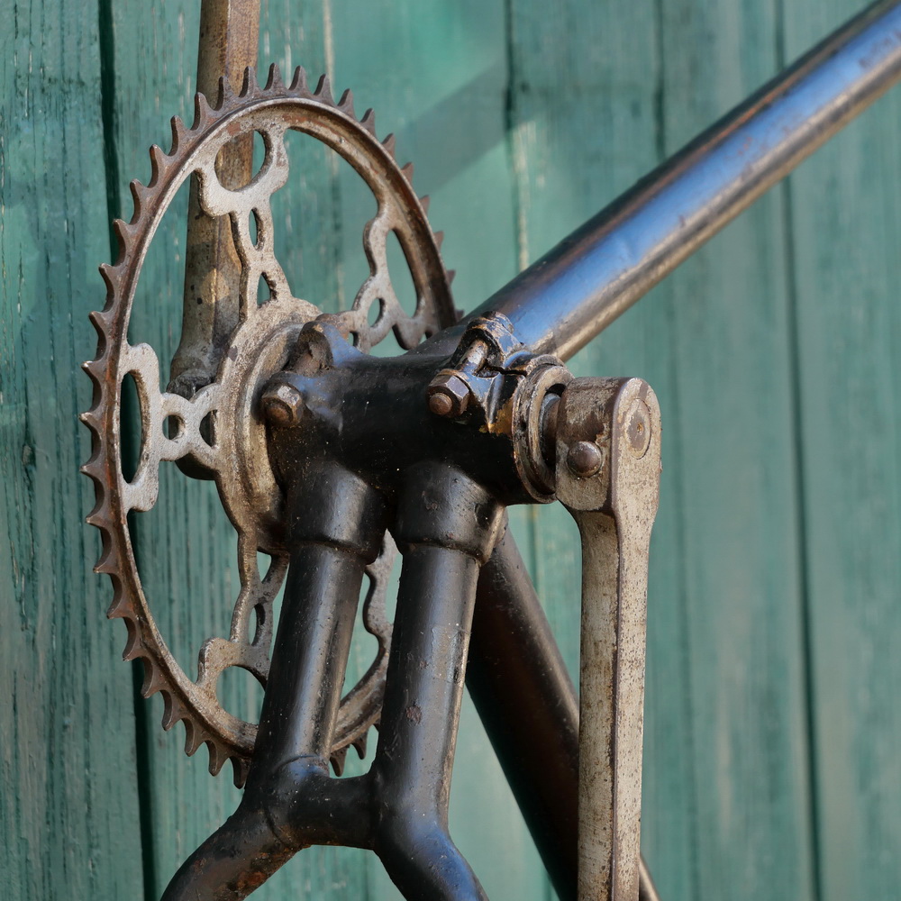 Fahrradrahmen GÖRICKE, Herren, für Sport-Ballonrad, 26 Zoll, Stahl, Ende 20er/ Anf. 30er J., schwarz/silber, Rahmenhöhe 56 cm, Rahmennummer 267XXX, Einbaumaß 108 mm, Schraubschalen-Keillager, Kettenblatt 48 Zähne, gebraucht, überstrichen, Lager o.k., Zustand gemäß Fotos