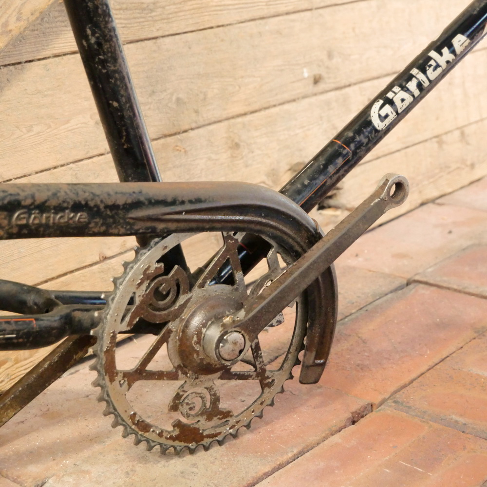 Fahrradrahmen GÖRICKE, für Tourenrad, Herren, 28 Zoll, 50er J., Stahl, schwarz, Linien weiß/rot, Rahmenhöhe 56 cm, Einbaumaß ca. 112 mm, Glockenlager verchromt, Kettenblatt 46 Zähne, Rahmen-Nr. 2101XXX, gebraucht mit Patina, Lager überholungsbedüftig, inkl. original Kettenschutz, Zustand gemäß Fotos