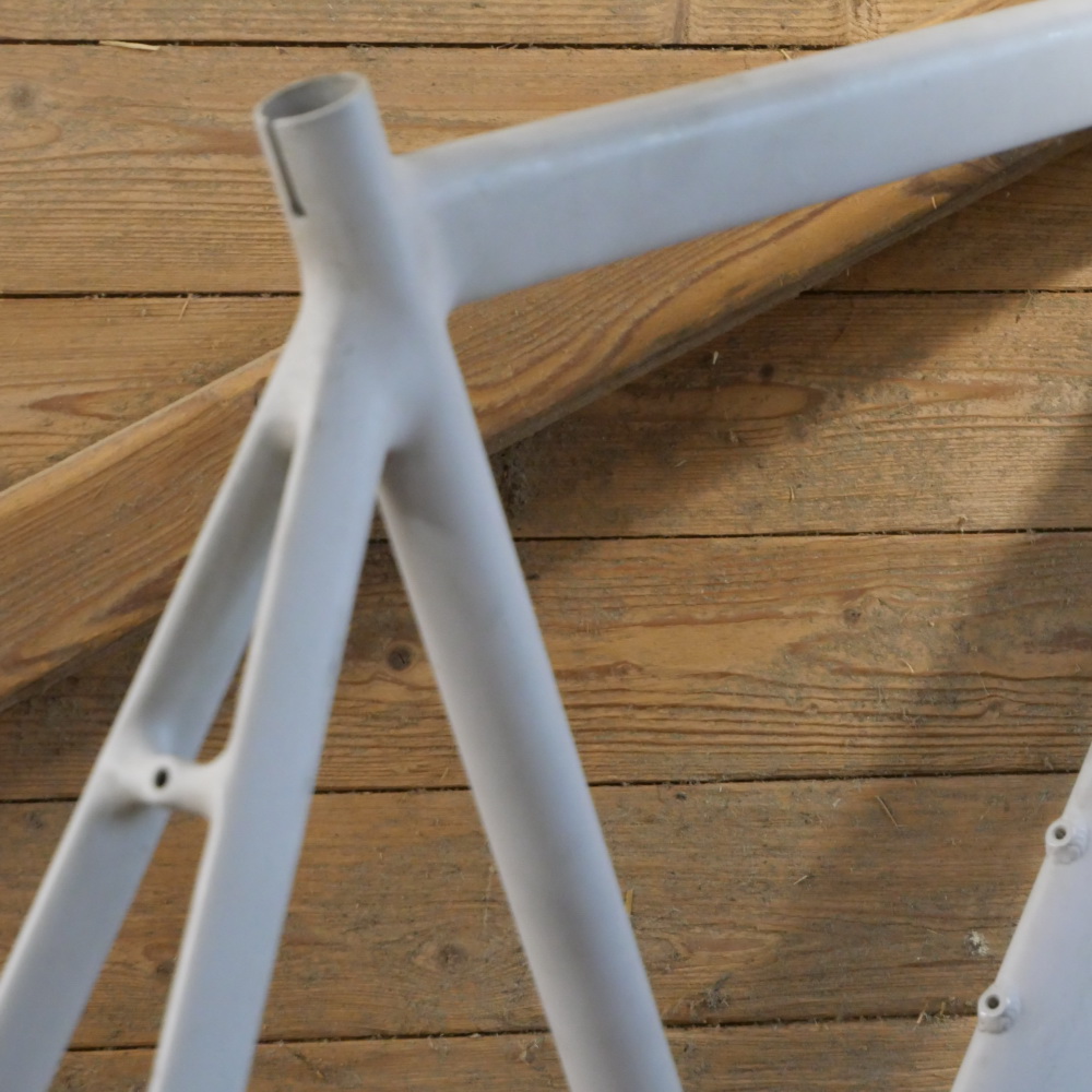 Fahrradrahmen, Herrenausführung für Rennrad 28 Zoll, Aluminium gepulvert, um 2000, hellgrau, Schweißnähte verschliffen, Rahmenhöhe 56 cm, Einbaumaß 132mm, Innenlager BSA, ohne Gabel! Steuerrohr: Durchmesser für 1 Zoll, Höhe 120mm, Sattelklemmschelle Durchmesser 31,8mm, Lagerspuren, Zustand gemäß Fotos