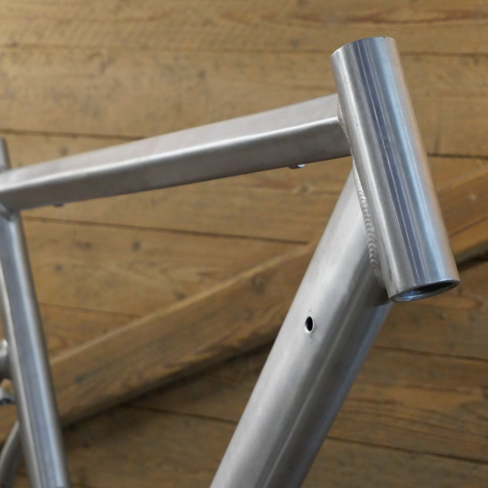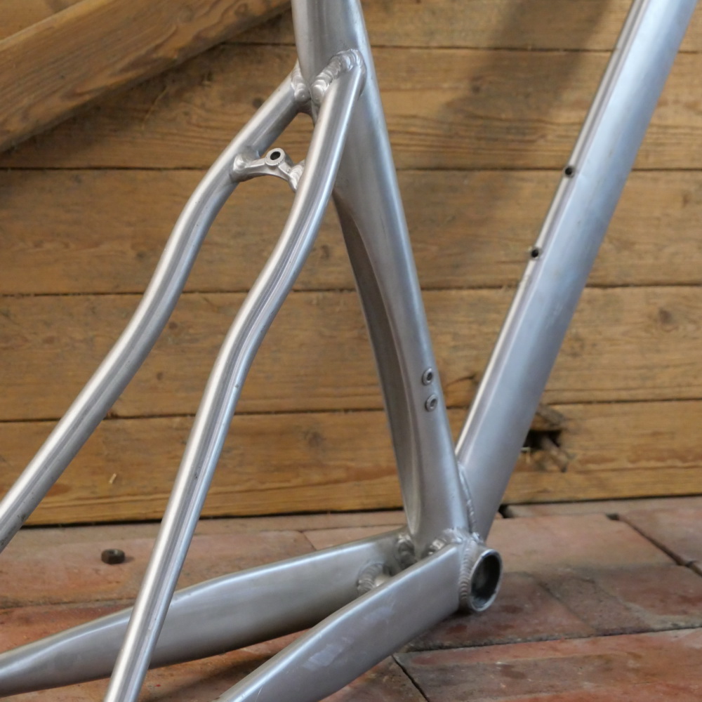 Fahrradrahmen, Herrenausführung für Rennrad 28 Zoll, Aluminium roh, um 2000, sehr enger Radstand da Sattelrohr gefurcht, Rahmenhöhe 57 cm, Einbaumaß 132mm, Innenlager BSA, ohne Gabel! Steuerrohr: Durchmesser für 1 Zoll, Höhe 140mm, Gegenhalter für Schaltzüge fehlen, sonst schöner Zustand gemäß Fotos