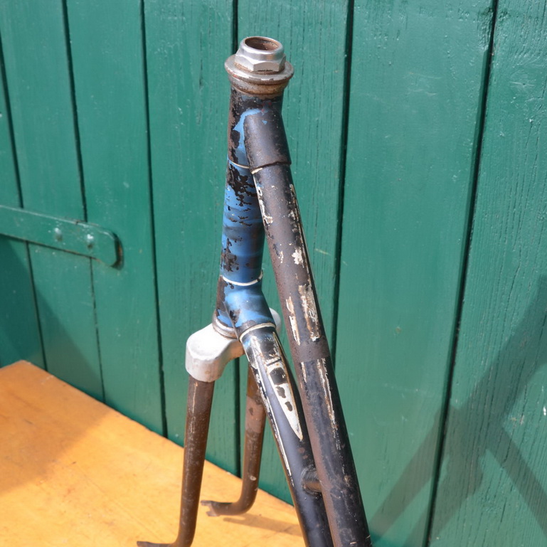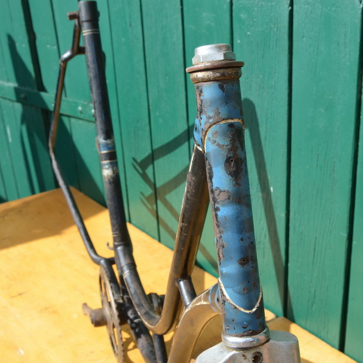 Fahrradrahmen "NSU-Opel", Damenausführung von 1937, 28 Zoll, Linierung blau/weiß mit Strahlenkopf, Rahmenhöhe 55 cm, Rahmennummer 9998XXX