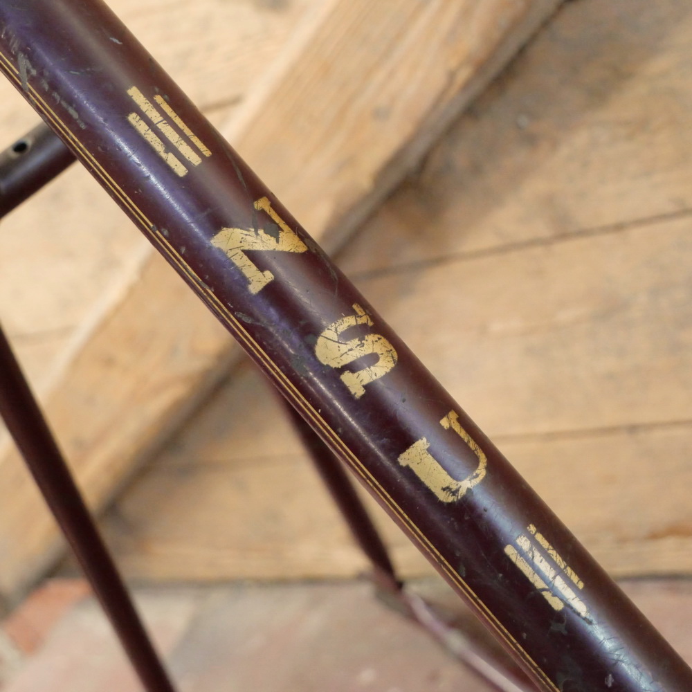Fahrradrahmen NSU, für Ballonrad, Damen, 26 Zoll, Stahl, 50er J., weinrot, Linien gold, Strahlenkopf silber, Rahmenhöhe 50 cm, Einbaumaß 118 mm, Tretlagergehäuse Durchmesser 40 mm/Breite 70 mm, Steuerkopfhöhe 150 mm, Rahmen-Nr. 579XXX, gebraucht mit schöner Patina, ohne Steuerkopfschild, Zustand gemäß Fotos