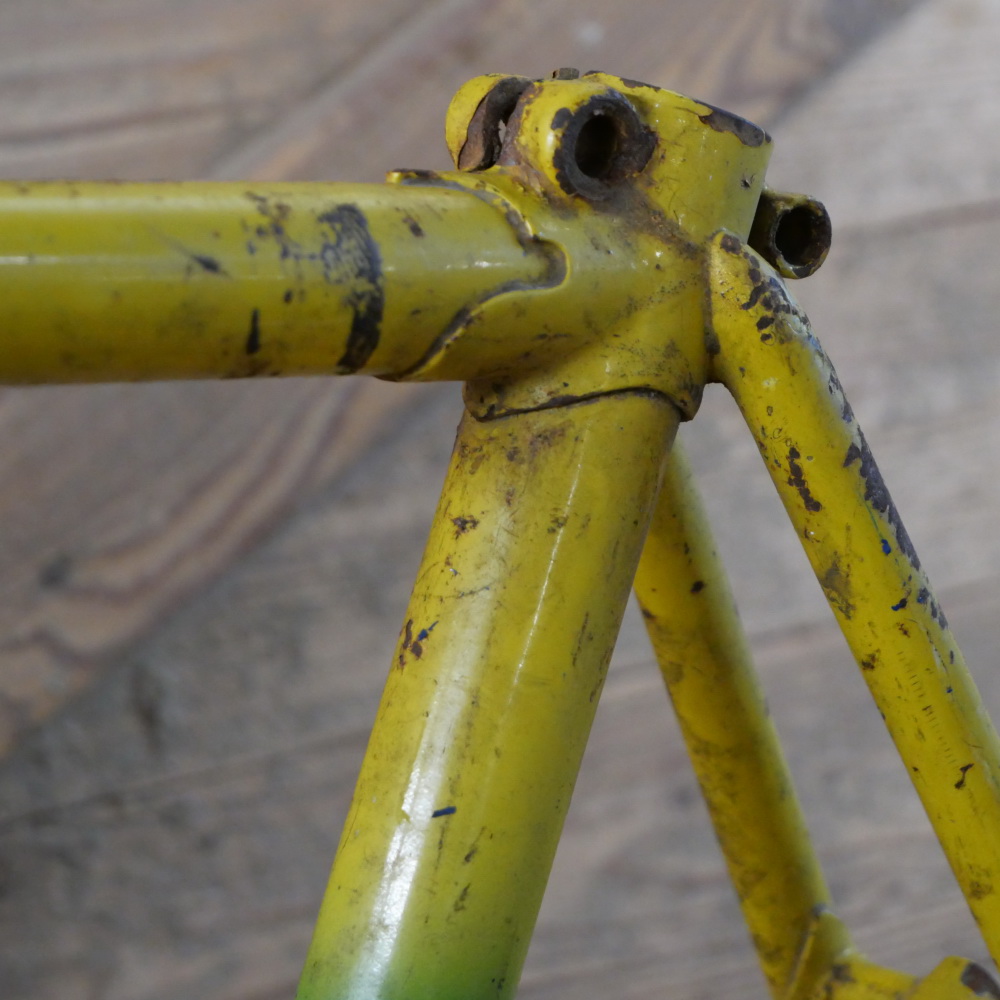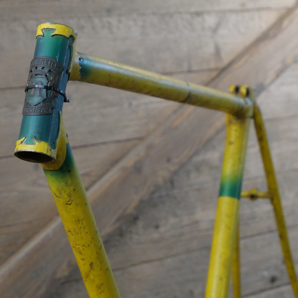 Fahrradrahmen Rabeneick Team, Herrenausführung für Rennrad 27/28 Zoll, Stahl, frühe 1950er Jahre, gelb/grün, sehr hochwertige Ausführung mit Nervex-Muffen, Rahmenhöhe 56 cm, Rahmennummer: 267XXX, Einbaumaß 123mm, Innenlager BSA, ohne Gabel! Steuerrohr: Durchmesser für 1 Zoll, Höhe 115mm, gebraucht, Substanz gut, Zustand gemäß Fotos