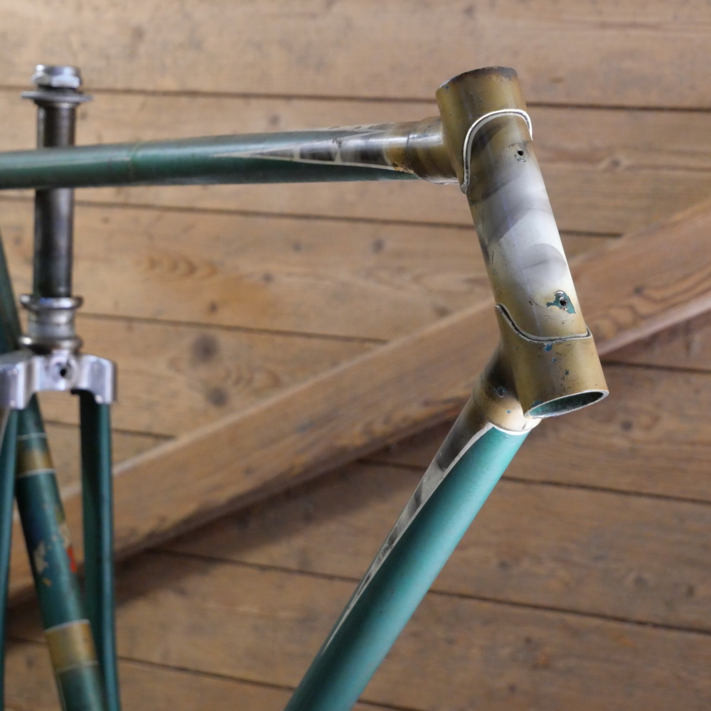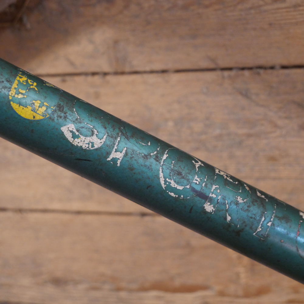 Fahrradrahmen SPORT, Herrenausführung, Tourenrad, 50er J., 26 Zoll, grün, Strahlenkopf weiß/gold geflammt, Linien weiß/gold, Rahmenhöhe 55 cm, Oberrohr 62 cm, Rahmennummer 15XXX, Einbaubreite 110 mm, Thompson Tretlagermuffe 70/40 mm, Gabel und Steuersatz demontiert, ohne Steuerkopfschild, gebraucht mit schöner Patina, Zustand gemäß Fotos