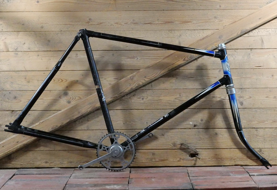 Fahrradrahmen TURNIER/GÖRICKE, Herrenausführung, 26 Zoll, 1950er Jahre, schwarz, Strahlenkopf blau/weiß, Linien weiß, Rahmenhöhe 56 cm, Einbaumaß ca. 115 mm, Rahmennummer 747XXX, Keillager mit Kettenblatt 44 Zähne, gebraucht mit schöner Patina, Lager gut, Zustand gemäß Fotos