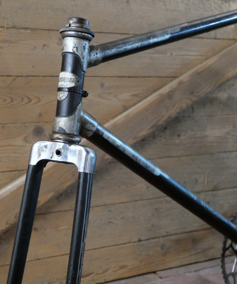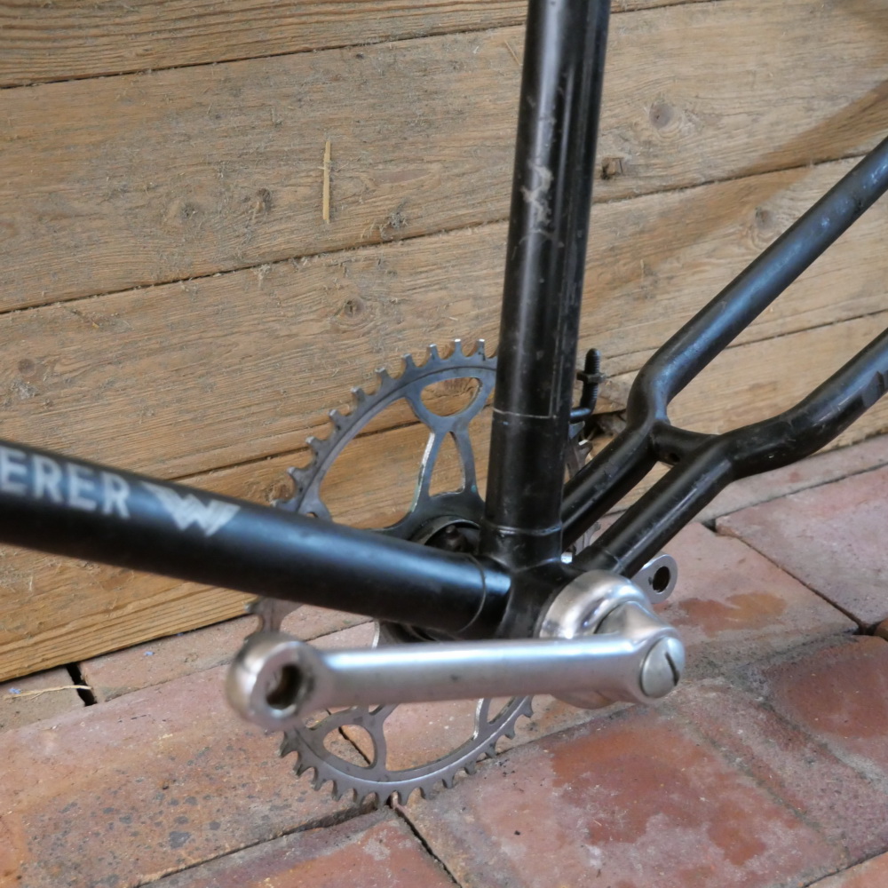 Fahrradrahmen Wanderer, 28 Zoll, Herrenausführung, mit Tretlager, Steuerkopfschild und Bandfeststeller, schwarz, Linien Silber/blau, Strahlenkopf weiß geflammt, Rahmenhöhe 55 cm, Rahmennummer 2042XXX, Kettenblatt 46 Zähne, Gebraucht mit schöner Patina, kleine Kerbe an Hinterbaustrebe, Lager gut, Zustand gemäß Fotos