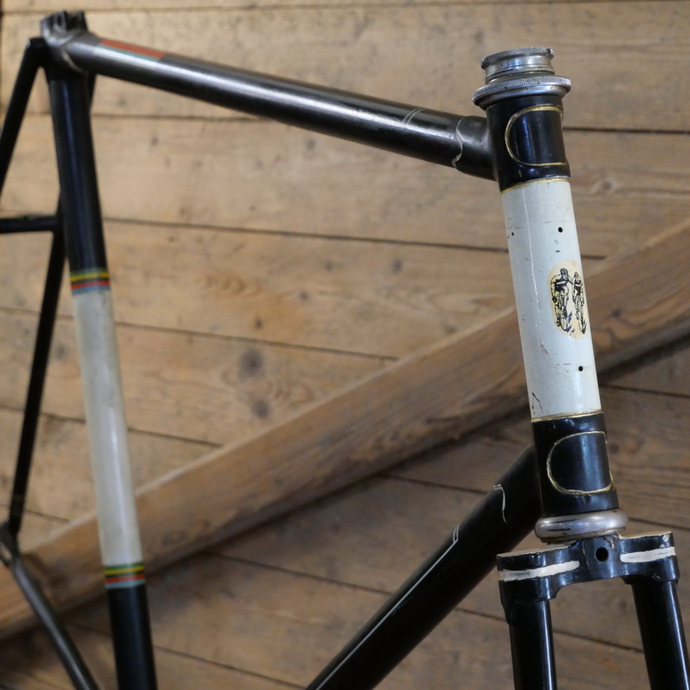 Fahrradrahmen für Rennrad, 28 Zoll, Stahl, 30er-50er J., alte Händlerneulackierung aus Berlin, schwarz/weiss, Linien gold/weiss, Rahmenhöhe 60,5 cm, Oberrohrlänge 57,5 cm, Einbaumaß 108 mm, Spezial-Innenlager 72/41 mm ohne Gewinde mit Klemmkeilen, Rahmen-Nr. 648XXX, ohne Steuerkopfschild, Lochabstand 64 mm, gebraucht mit schöner Patina, Zustand gemäß Fotos