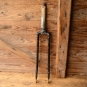 Gabel 28 Zoll, orig. Opel, Schaftlänge 380 mm, Weite oben 56 mm, 30er Jahre, Scheiden beidseitig verzogen. Zustand siehe Bilder.
