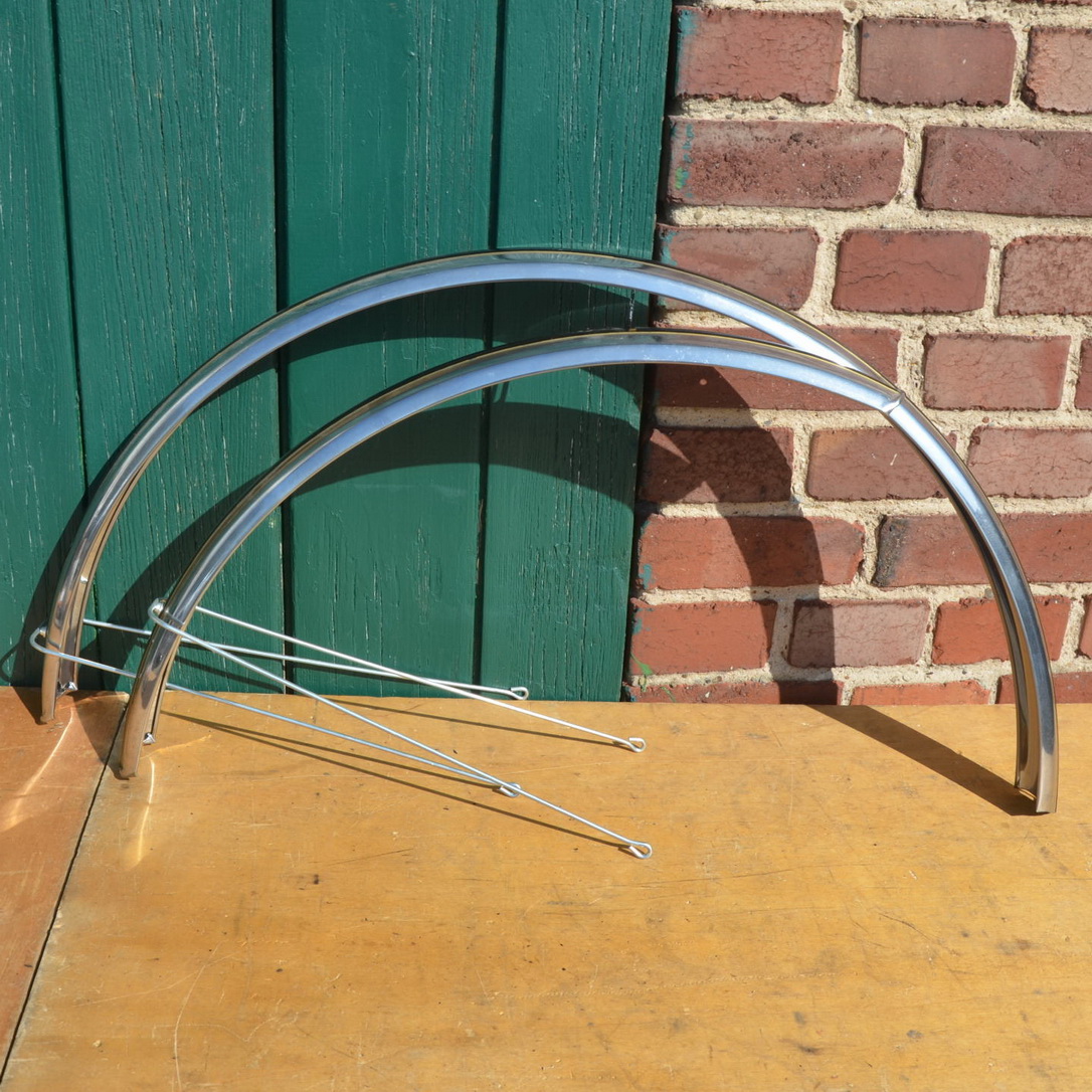 Schutzblechsatz 28 Zoll, Edelstahl mit Handlinierung, Dekor schwarz/gold, restauriert