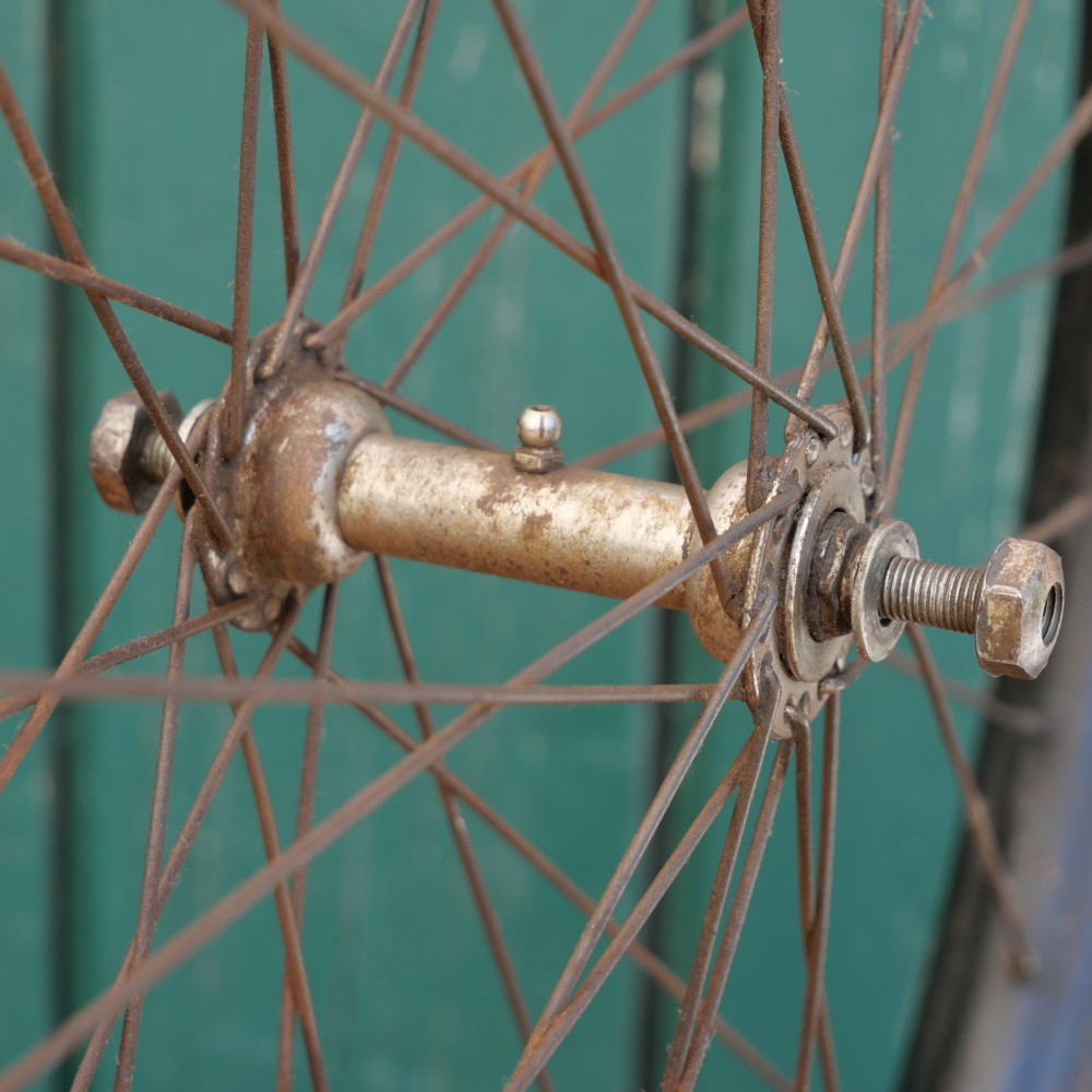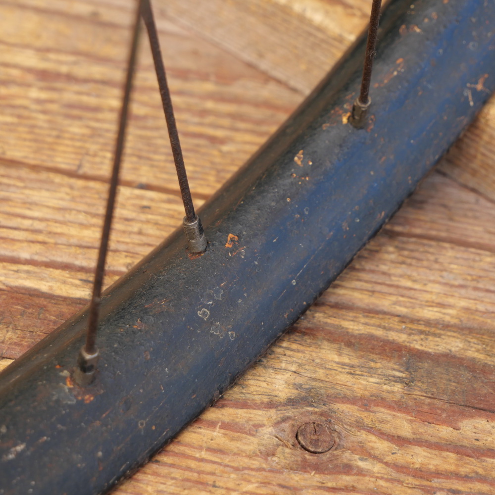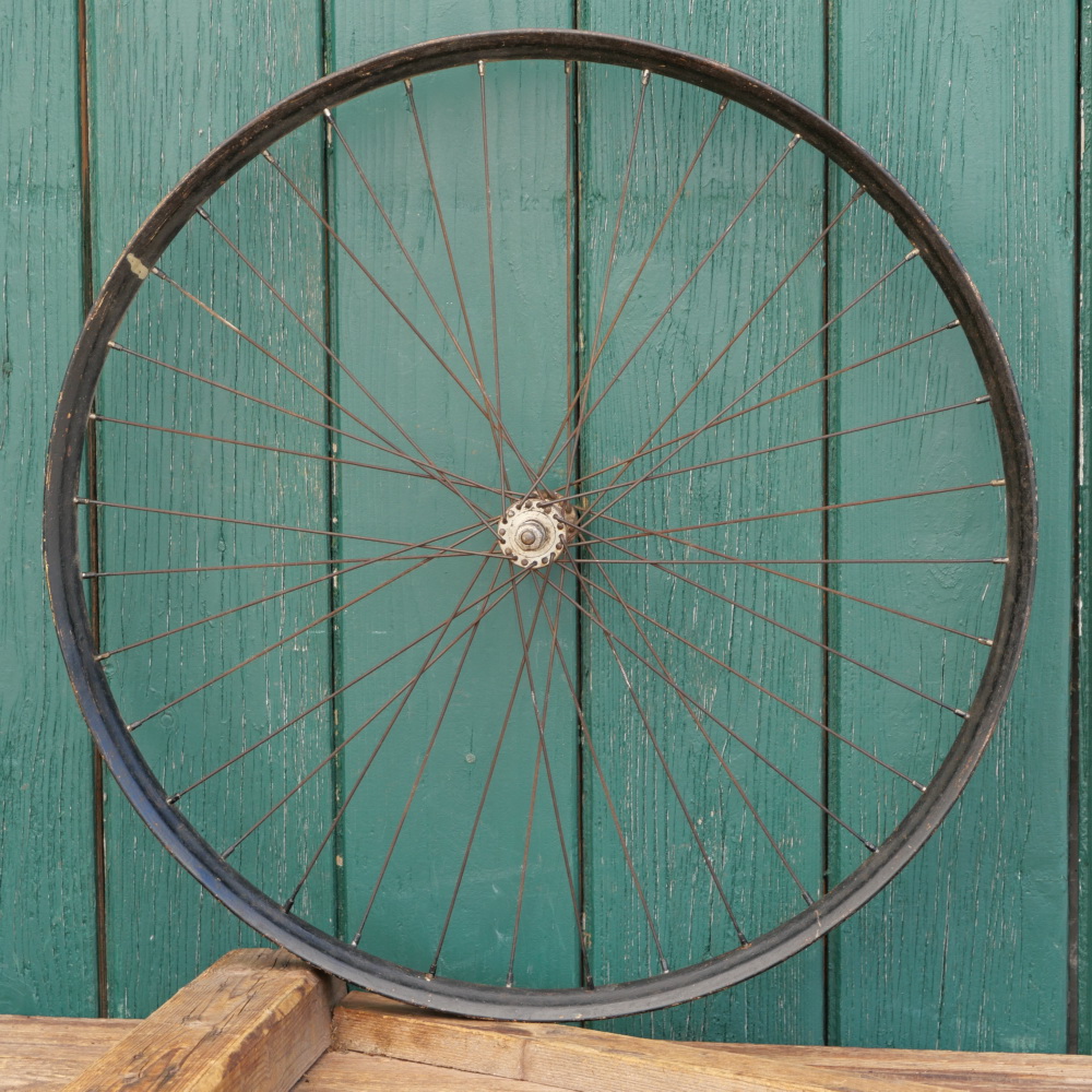Vorderrad 26 Zoll (559) für OPEL Ballonrad, 30er J., schwarz, Breite ca. 38 mm, F&S-Nabe, verchromt, Einbaumaß: ca. 86 mm, 2 mm Chrom-Speichen, gebraucht, felge überstrichen, Zustand gemäß Fotos