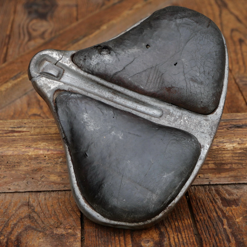 Sattel, Damen, THE CHRISTYS, Leder gepolstert, braun, Gestell vernickelt, USA um 1896, wurde viel in Deutschland verkauft, Breite ca. 23 cm, Länge ca. 19 cm, gebraucht, teilweise überstrichen, Metallrahmen vorn gerissen, für museale Zwecke, Zustand siehe Bilder.