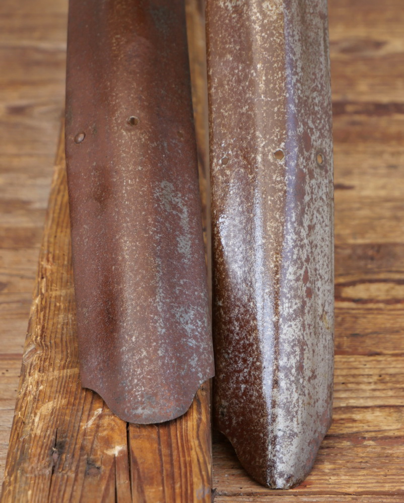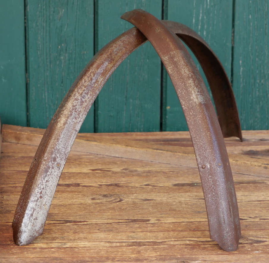 Schutzbleche Satz, 28 Zoll, Herrenausführung für Tourenrad, Form wie bei ADLER, 10er/20er J., ohne Lack, Breite ca. 53 mm, alte Neuware mit Lagerungsspuren, Zustand gemäß Fotos.