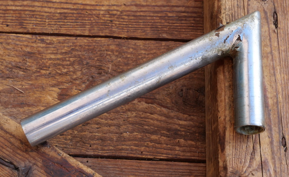 Winkelsattelstütze, Durchmesser: ca. 22,2 mm, Schaftlänge: ca 160 mm, verchromt, orig. 20er/30er Jahre, gebraucht mit Patina, Zustand siehe Foto.