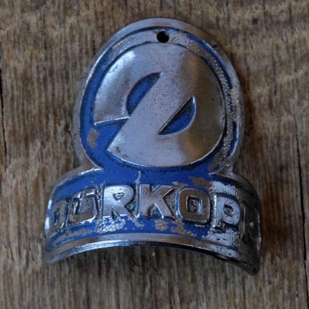 Steuerkopfschild DÜRKOPP, 50er Jahre, Originalschild aus Sammlungsbestand, Lochabstand (diagonal) 38 mm Ideal für den passenden Fahrradoldtimer oder die Sammlervitrine. Zustand siehe Bild. Übrigens: Wir haben noch eine Riesenmenge weiterer Steuerkopfschilder und Schutzblechembleme im Bestand, die wir niemals alle listen können. Fragt einfach an, wenn Ihr auf der Suche nach einem speziellen Schild oder Emblem seid, vielleicht können wir helfen.