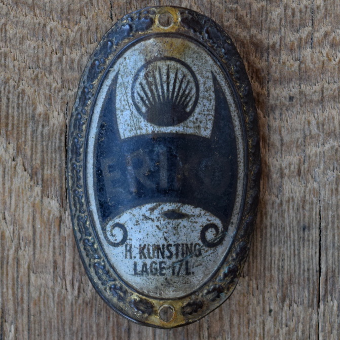 Steuerkopfschild ERIKO, 50er Jahre, Originalschild aus Sammlungsbestand, Lochabstand 58 mm Ideal für den passenden Fahrradoldtimer oder die Sammlervitrine. Zustand siehe Bild. Übrigens: Wir haben noch eine Riesenmenge weiterer Steuerkopfschilder und Schutzblechembleme im Bestand, die wir niemals alle listen können. Fragt einfach an, wenn Ihr auf der Suche nach einem speziellen Schild oder Emblem seid, vielleicht können wir helfen.