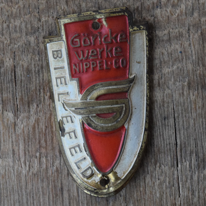 Steuerkopfschild GÖRICKEWERKE, 50er Jahre, Originalschild aus Sammlungsbestand, Lochabstand 50 mm Ideal für den passenden Fahrradoldtimer oder die Sammlervitrine. Zustand siehe Bild. Übrigens: Wir haben noch eine Riesenmenge weiterer Steuerkopfschilder und Schutzblechembleme im Bestand, die wir niemals alle listen können. Fragt einfach an, wenn Ihr auf der Suche nach einem speziellen Schild oder Emblem seid, vielleicht können wir helfen.