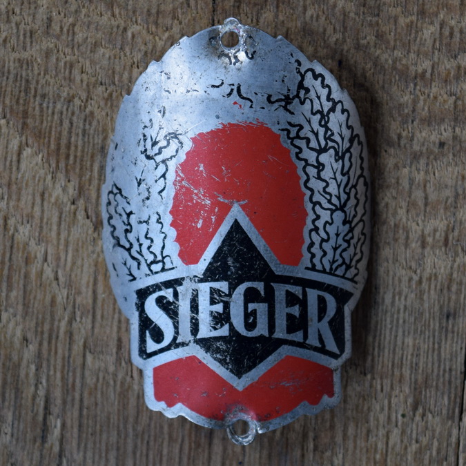 Steuerkopfschild SIEGER, 50er Jahre, Originalschild aus Sammlungsbestand, Lochabstand 59 mm Ideal für den passenden Fahrradoldtimer oder die Sammlervitrine. Zustand siehe Bild. Übrigens: Wir haben noch eine Riesenmenge weiterer Steuerkopfschilder und Schutzblechembleme im Bestand, die wir niemals alle listen können. Fragt einfach an, wenn Ihr auf der Suche nach einem speziellen Schild oder Emblem seid, vielleicht können wir helfen.