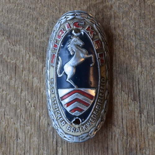 Steuerkopfschild Stricker, 50er Jahre, Originalschild aus Sammlungsbestand, Lochabstand 45 mm Ideal für den passenden Fahrradoldtimer oder die Sammlervitrine. Zustand siehe Bild. Übrigens: Wir haben noch eine Riesenmenge weiterer Steuerkopfschilder und Schutzblechembleme im Bestand, die wir niemals alle listen können. Fragt einfach an, wenn Ihr auf der Suche nach einem speziellen Schild oder Emblem seid, vielleicht können wir helfen.
