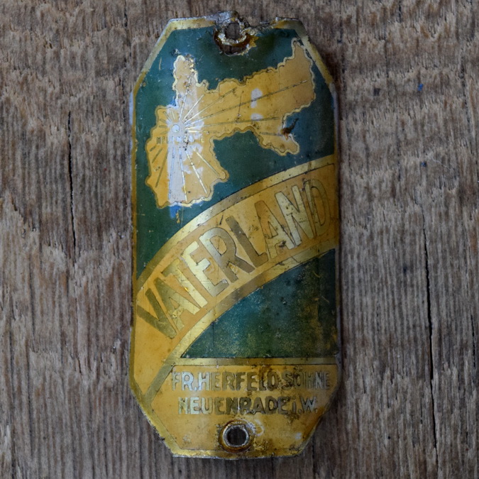 Steuerkopfschild VATERLAND, 30er Jahre, Originalschild aus Sammlungsbestand, Lochabstand 58 mm Ideal für den passenden Fahrradoldtimer oder die Sammlervitrine. Zustand siehe Bild. Übrigens: Wir haben noch eine Riesenmenge weiterer Steuerkopfschilder und Schutzblechembleme im Bestand, die wir niemals alle listen können. Fragt einfach an, wenn Ihr auf der Suche nach einem speziellen Schild oder Emblem seid, vielleicht können wir helfen.