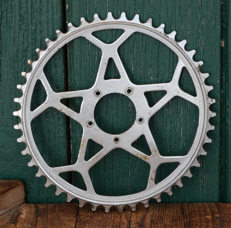 Kettenblatt MIELE, für Sportrad, 50er J., 1/2 Zoll, verchromt, 46 Zähne, 5-Punkt-Aufnahme mit Durchmesser 40mm, gebraucht mit schöner Patina, Zustand siehe Fotos