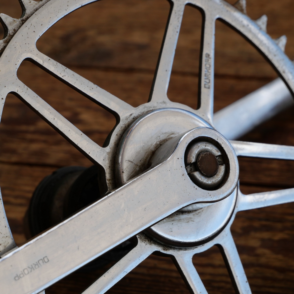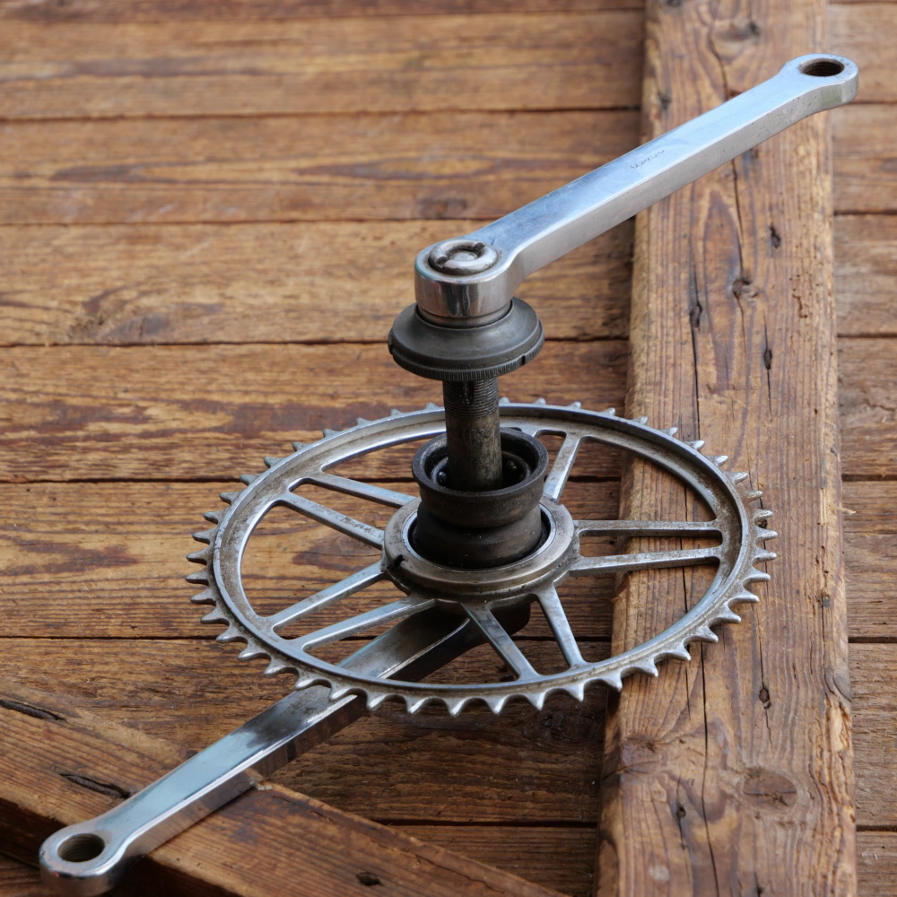 Tretlager DÜRKOPP für Tourenrad, orig. 30er/40er J., verchromt/Grauguss, Glockenlager, Kettenblatt 46 Zähne, Kurbellänge 180 mm, inkl. komplettem Lager, Schalendurchmesser 40 mm, leicht gebraucht mit schöner Patina, sehr guter Zustand siehe Bilder.