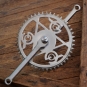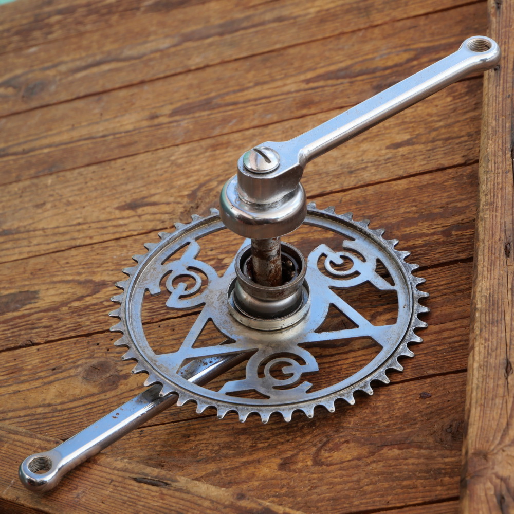 Tretlager GÖRICKE für Tourenrad, orig. 60er/70er J., verchromt, Glockenlager, Kettenblatt 46 Zähne, Kurbellänge 175 mm, inkl. komplettem Lager, Schalendurchmesser 40 mm, gebraucht mit schöner Patina, guter Zustand siehe Bilder.
