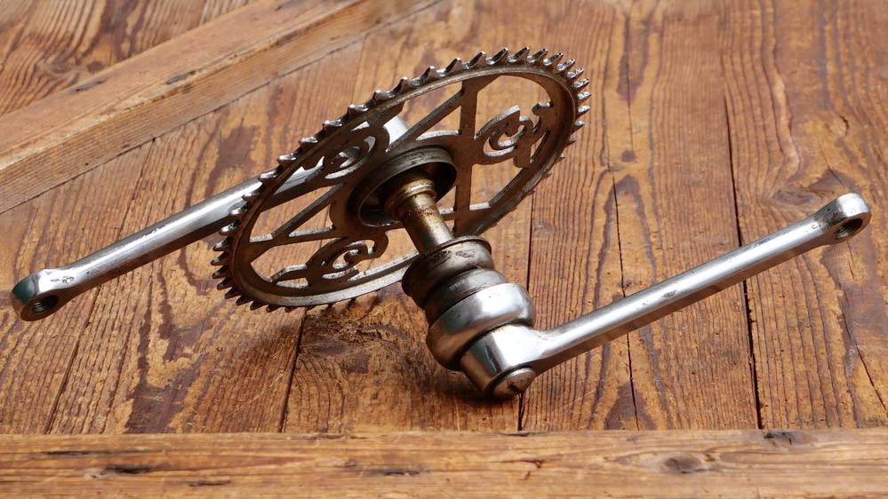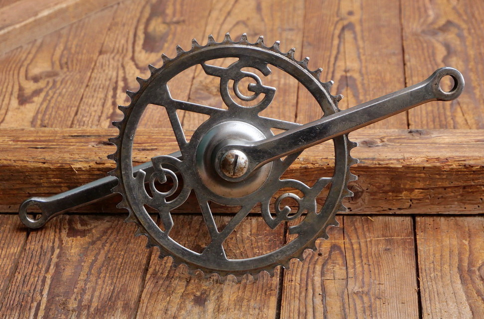 Tretlager GÖRICKE für Tourenrad, orig. 60er/70er J., verchromt, Glockenlager, Kettenblatt 46 Zähne, Kurbellänge 170 mm, inkl. komplettem Lager, Schalendurchmesser 40 mm, gebraucht mit Patina, Lager o.k, Zustand siehe Bilder.