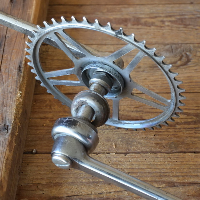 Tretlager Glockenausf., orig. 50er Jahre, verchromt, Lagerschalen 40 mm, gebraucht mit alterstypischen Gebrauchsspuren, siehe Bilder. Achslänge: 140 mm, Kurbellänge: 172 mm. Rares Originalteil für den passenden Klassiker mit 40 x 70 mm Standard-Tretlagergehäuse (ohne Schalen gemessen) , Hinweis zum Zustand: Die Tretlager sind unrestauriert, in der Substanz aber ok. Optik und Zustand der Zähne, siehe Bilder. Die Konen und Lager müssen, soweit überhaupt dabei und je nach Anspruch an den technischen Zustand, ggf. überholt/ergänzt oder ausgetauscht werden. Ersatzteile können wir für viele Typen gegen Berechnung liefern.