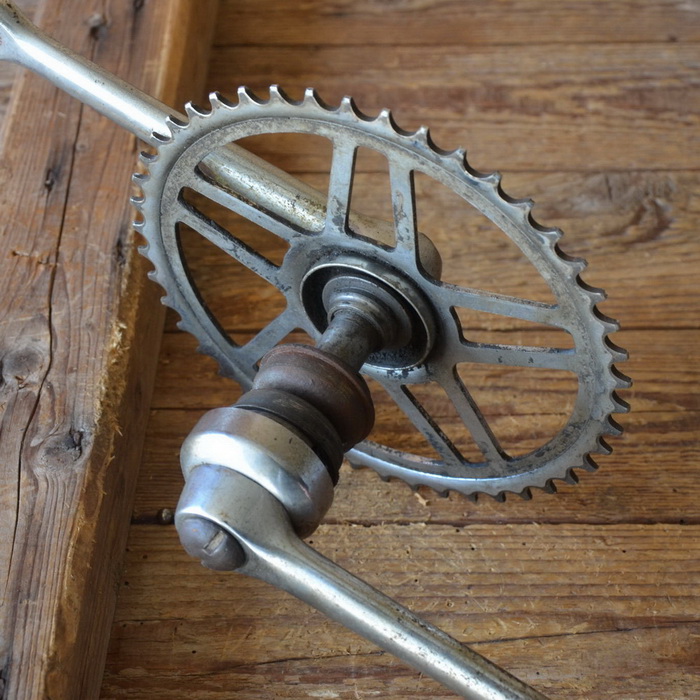 Tretlager Glockenausf., orig. 50er Jahre, verchromt, Lagerschalen 40 mm, gebraucht mit alterstypischen Gebrauchsspuren, siehe Bilder. Achslänge: 135 mm, Kurbellänge: 172 mm. Rares Originalteil für den passenden Klassiker mit 40 x 70 mm Standard-Tretlagergehäuse (ohne Schalen gemessen) , Hinweis zum Zustand: Die Tretlager sind unrestauriert, in der Substanz aber ok. Optik und Zustand der Zähne, siehe Bilder. Die Konen und Lager müssen, soweit überhaupt dabei und je nach Anspruch an den technischen Zustand, ggf. überholt/ergänzt oder ausgetauscht werden. Ersatzteile können wir für viele Typen gegen Berechnung liefern.